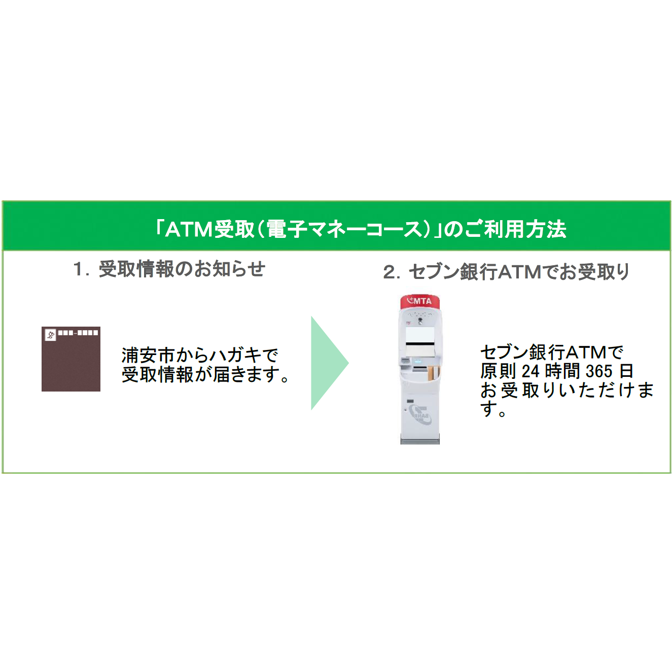 株式会社セブン銀行グループの株式会社セブン・ペイメントサービス(本社:東京都千代田区、代表取締役社長:河邉 弦)は、千葉県浦安市(市長:内田 悦嗣、以下 浦安市)へ「ATM受取(電子マネーコース)」の提供を開始しました。