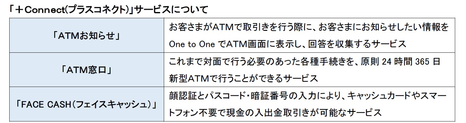 セブン銀行は、新型ATMが金融の枠を超え、「あらゆる手続き・認証の窓口となる」世界を目指し、「+Connect(プラスコネクト)」サービスを提供しています。その中に、お客さまがATMで取引きを行う際に、お客さまにお知らせしたい情報をATM画面に表示し、回答を収集する「ATMお知らせ」サービスと、これまで対面で行う必要のあった各種手続きを、原則24時間365日行うことができる「ATM窓口」サービス、顔認証とパスコードで現金入出金ができる「FACE CASH(フェイスキャッシュ)」があります。ATMが銀行口座の開設や住所変更、口座振替登録などの諸手続き、ホテルのチェックインなどの便利なサービスを安心して行える窓口になることで、ATMのサービスプラットフォームとしての社会価値を創出しています。