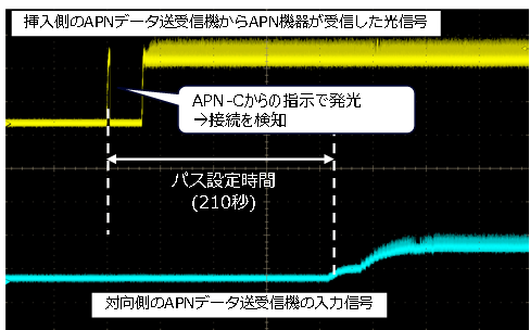 これらの動作をAPN機器6台からなるネットワークに対して行った結果、光ファイバ挿入側のデータ送受信機からの光信号をAPN機器で検出したのち、光パスが自動で設定され、対向側のデータ送受信機にてAPNの光パスを通過してきた光信号を検出することができました(図3)。