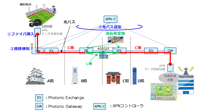 - ユーザが使いたい場所で使いたいときに、APNに機材をつなぐだけで自動的に接続できるようにするためのプラグ&プレイ機能、既存設備をそのまま使用して新たなサービスを提供可能なAPNを広げていくための波長帯変換機能の基本機能実証に成功いたしました。