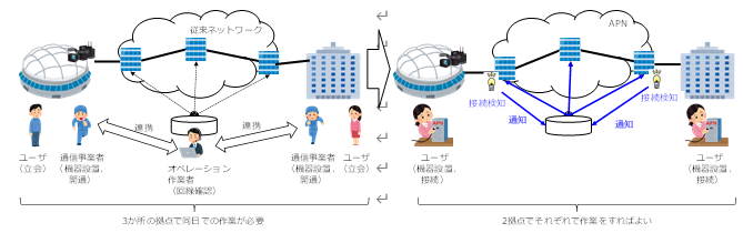 - オンデマンドでAPNに接続するユースケースとして、例えば、スポーツの試合の映像を放送局に送り放送局で編集する場合、試合の場所が本拠地と遠征地で変わるときに、開催地に作業者を派遣して開通作業を行うことなく、カメラやマイクなどの撮影機材をAPNに接続するだけで、編集拠点へのデータ送信が可能となります。