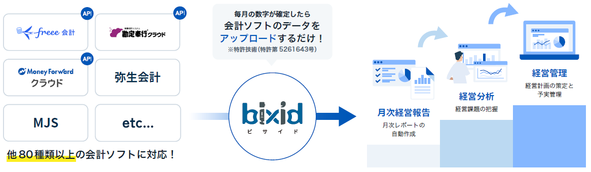 「bixid sponsored by 住信SBIネット銀行」は、法人のお客さまを対象とした資金繰り管理・経営計画策定サービスです。ご利用中の会計ソフト内にある過去の会計データをアップロードしていただくだけで、将来の資金繰り管理や経営計画策定が行えるなど、効率的な財務データの活用による迅速な経営判断にお役立ていただけます。