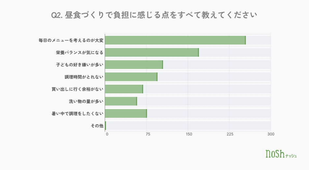 「非常に感じる(173人)」、「やや感じる(206人)」と回答した方は、全体の約63%にのぼりました。夏休みは子どもが日中も家にいる時間が長く、親が食事を用意する機会も増えるため、日常とは異なる負担がかかっていることがうかがえます。特に共働き世帯では、昼食の準備が大きなストレス要因となっていることが考えられます。