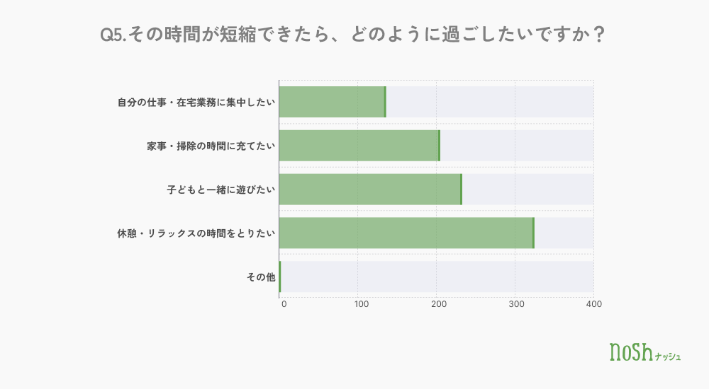 また、「Q5.その時間が短縮できたら、どのように過ごしたいですか?」という質問に対し、結果は次のとおりとなりました。(n=600)
