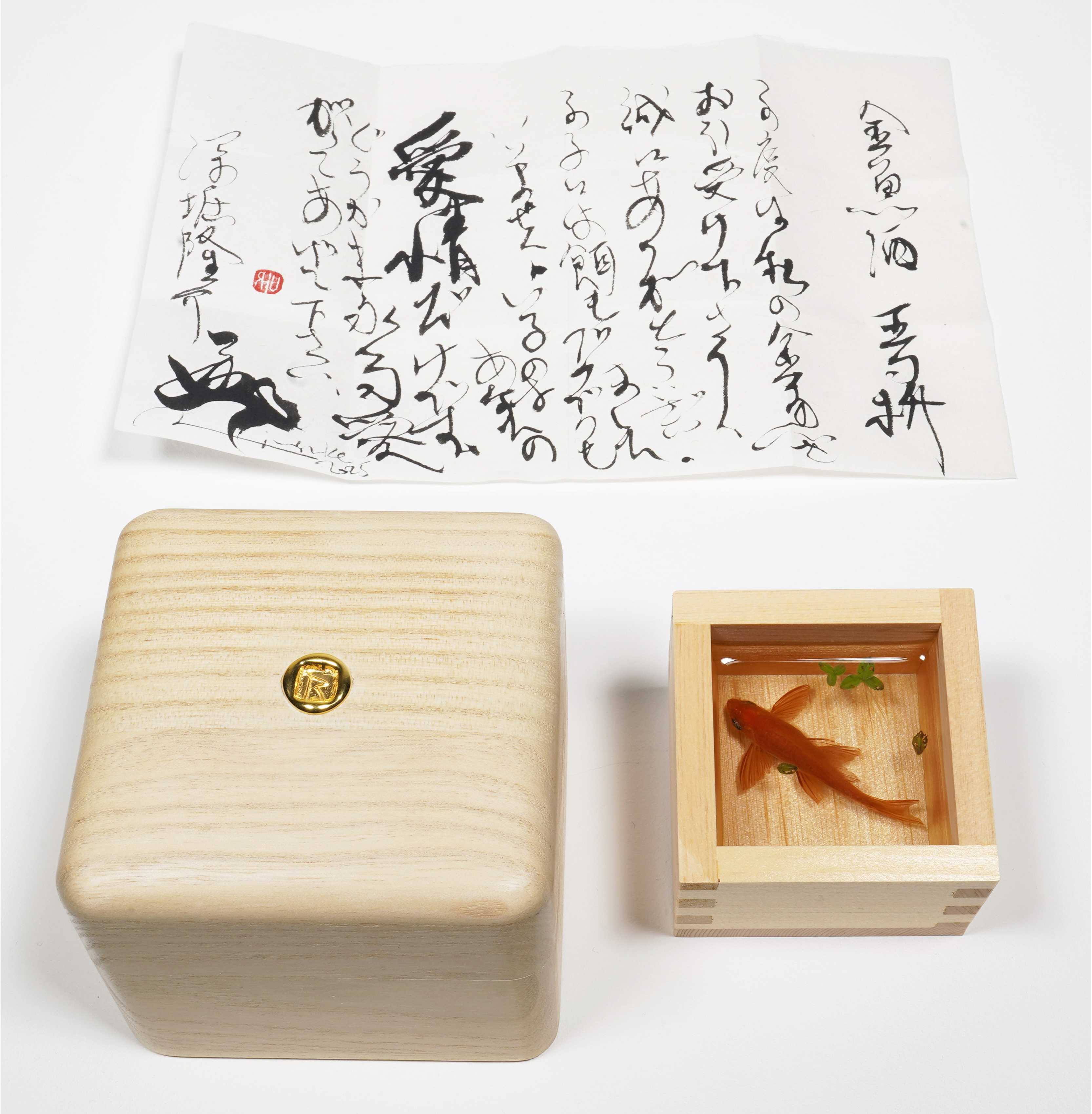 現代美術家で金魚絵師の深堀隆介氏の代表作「金魚酒」。その作品の外箱としての桐箱を、銀座 蔦屋書店のコンシェルジュがおつなぎし、高安桐工芸が作成しました。今回、深堀氏のご厚意で作品を展示します。