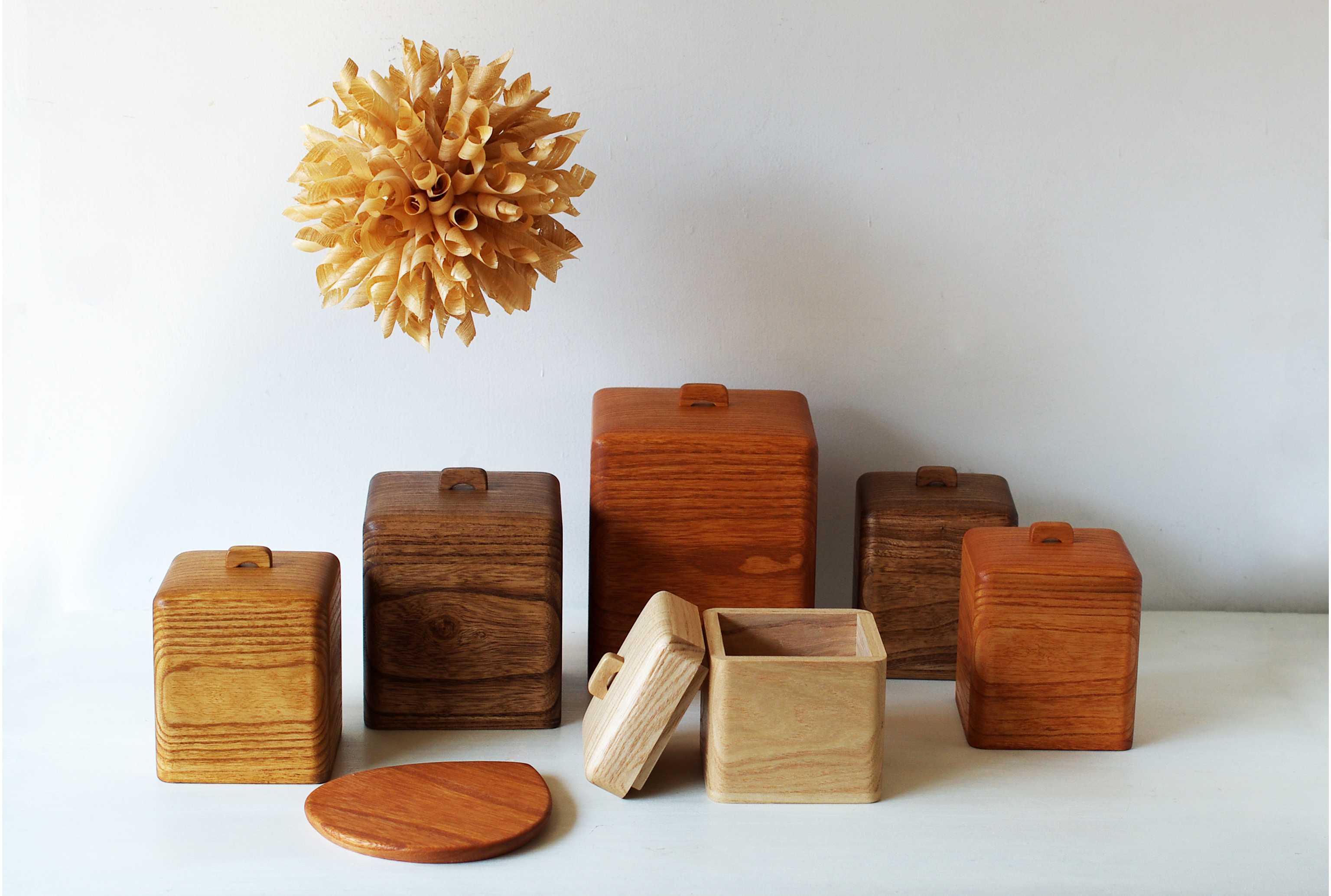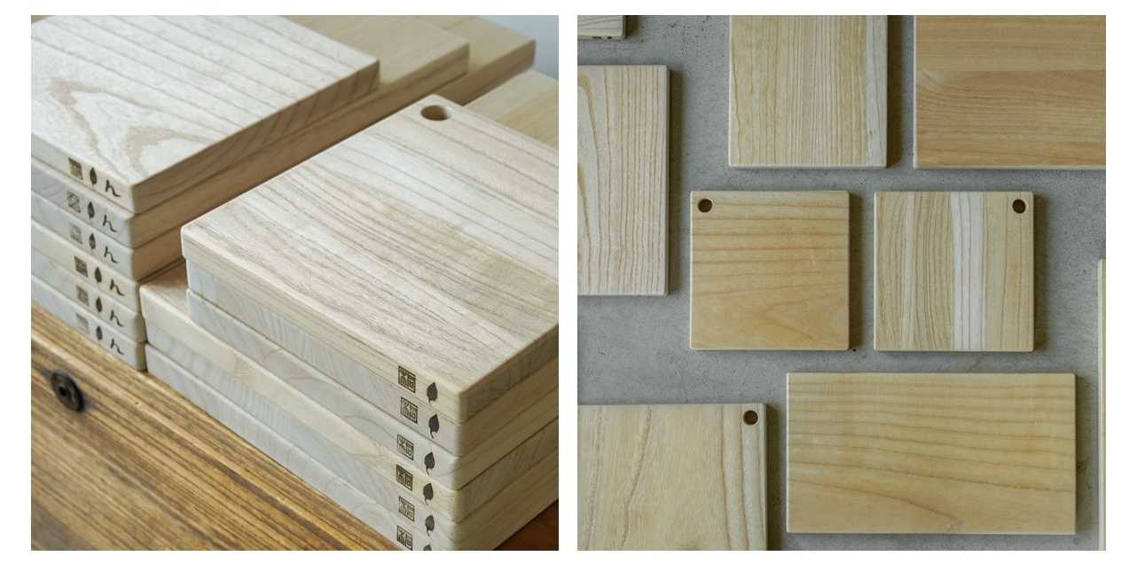 まな板は、一枚板のように丁寧に剥いだ材を使用。キャニスターやティッシュケースは、端正でシンプルなデザインが特徴です。