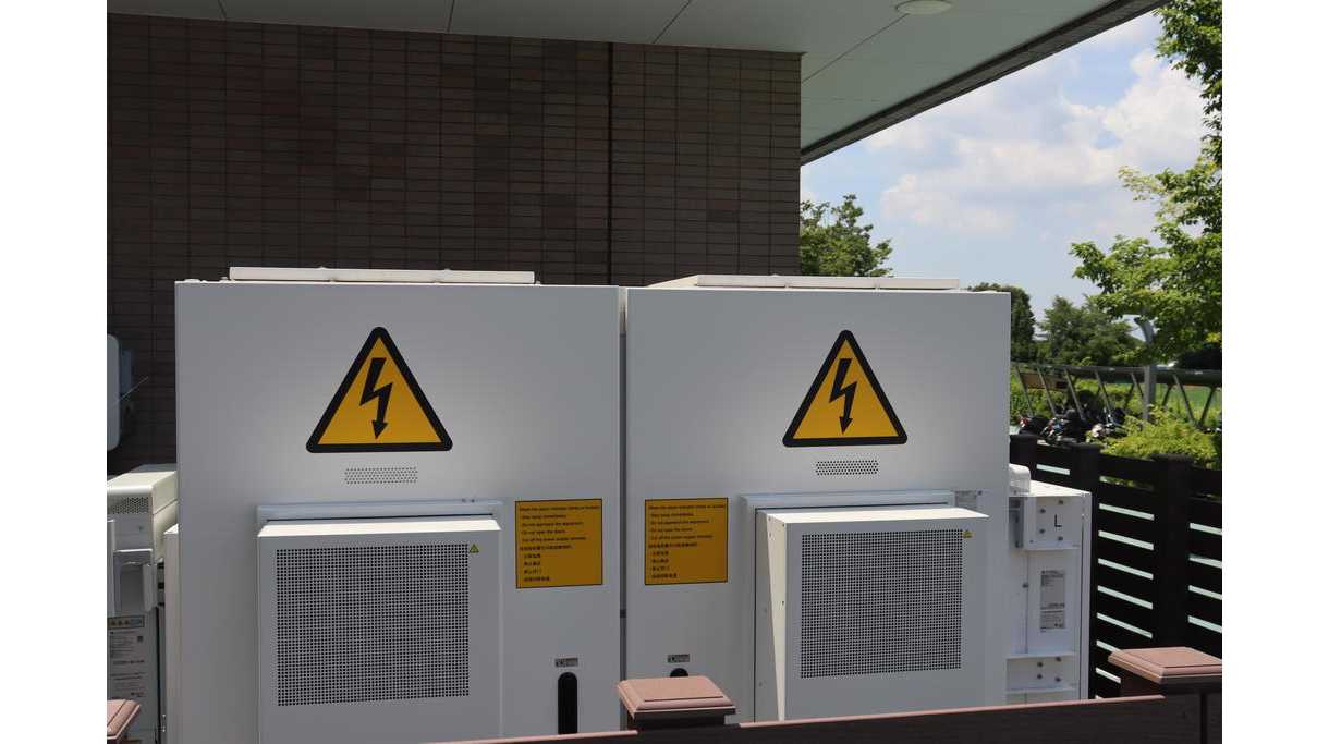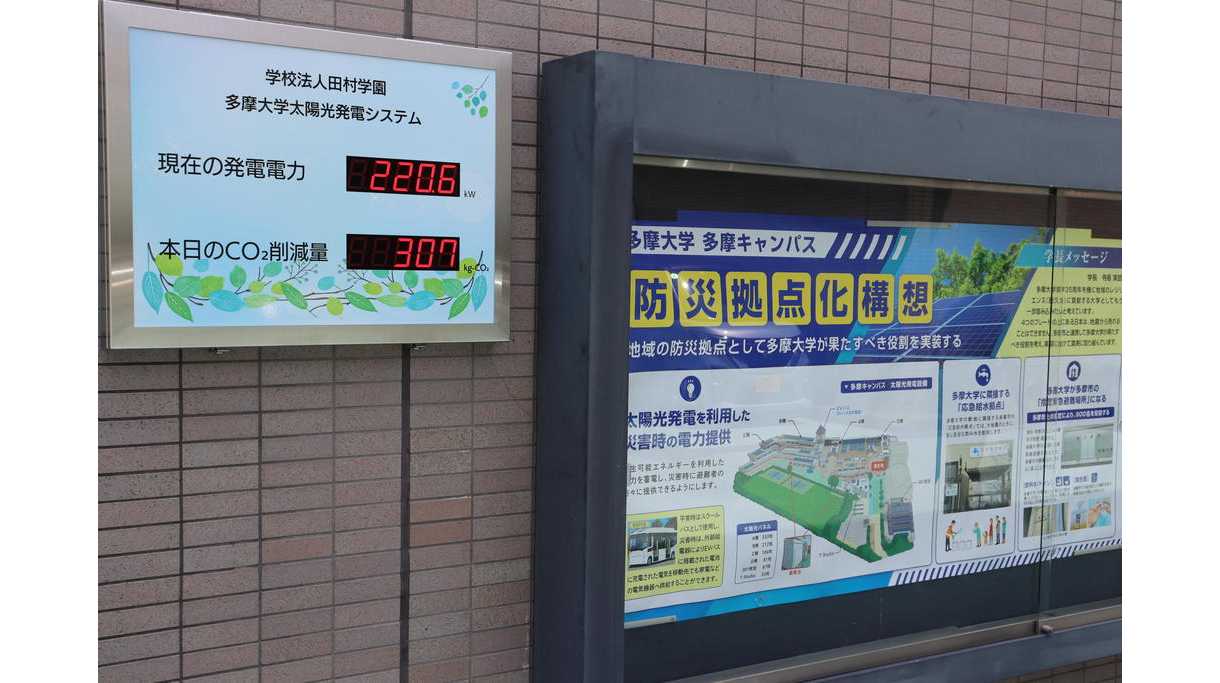 〇多摩大学/ 太陽光パネルを校舎の屋上に800枚以上設置。再生可能エネルギーを利用した電力を蓄電し、災害時に避難者の方々に提供できるようにする。また、EVバスを常に運航させて、災害時には蓄電池として利用する。