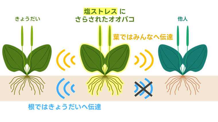 京都大学、弘前大学、名城大学、イスラエル・ベン=グリオン大学、福島大学の研究チームは、日本の在来植物であるオオバコ(Plantago asiatica)が塩ストレスを受けた際に、地上と地下の両方を通じてストレス情報を他の個体に伝達していること、さらに情報が伝わる相手が地上部と地下部で異なることを明らかにしました。