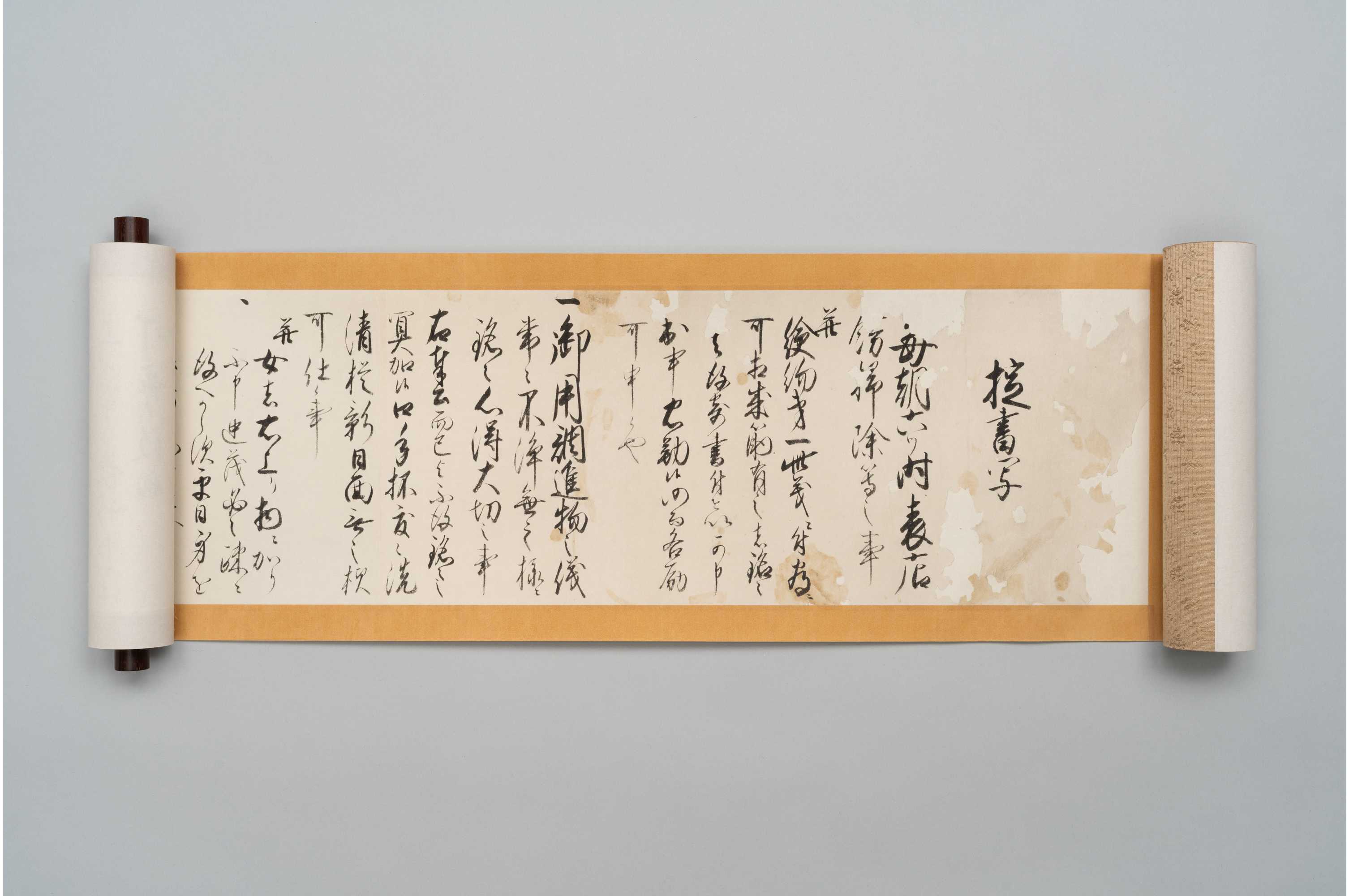 会場中央では、現在の就業規則に相当する、文化2年(1805)の「掟書」(下画像)、お客様へ菓子をお届けするのに使用した、伝元禄11年(1698)の竹虎青貝井籠(トップ画像)など、トリビアにまつわる史料を月替わりで展示します。