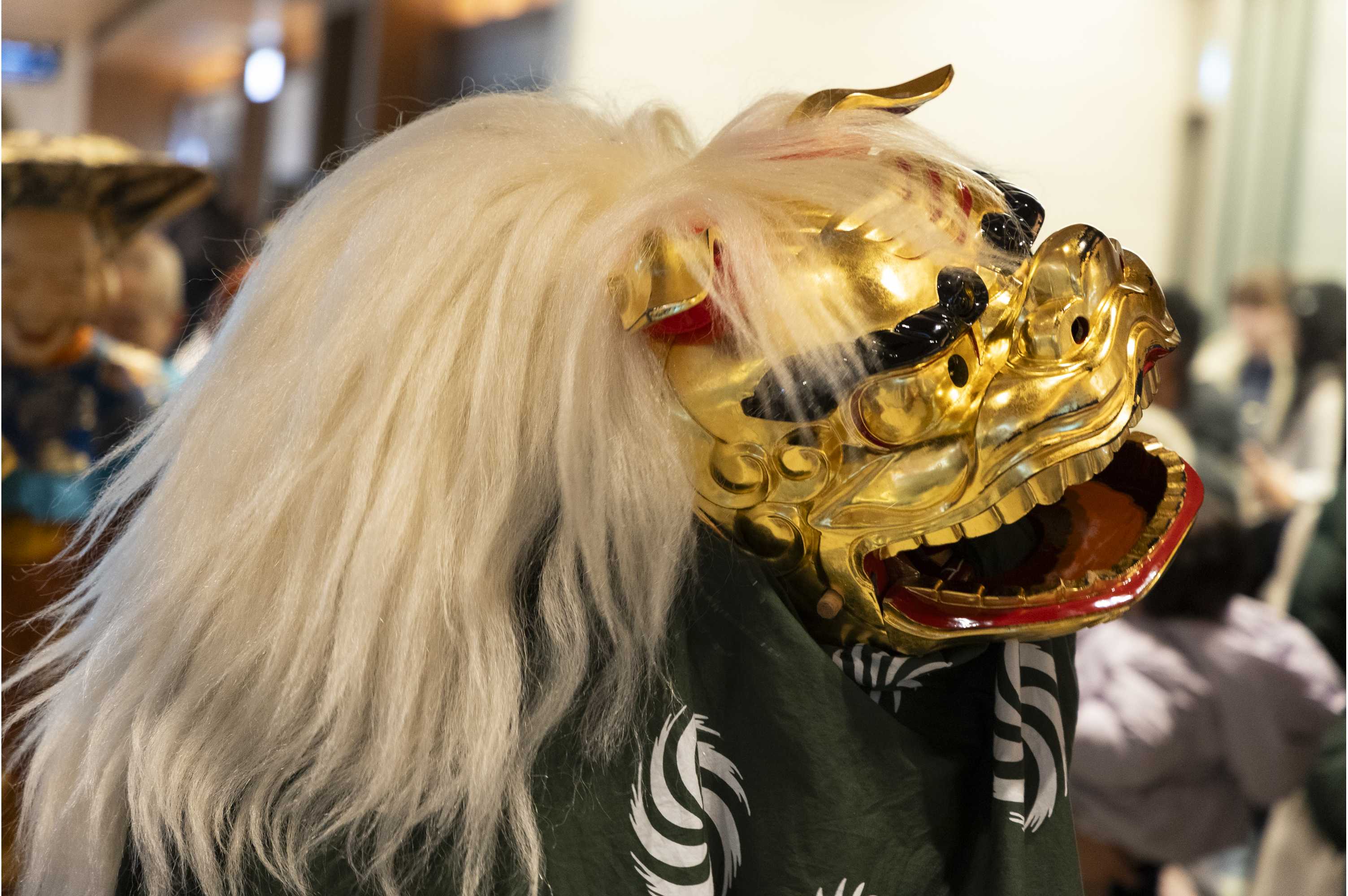 禍(わざわい)を払い、福を呼ぶといわれている「獅子舞」が、太鼓と笛の音に合わせて館内を練り歩きます。