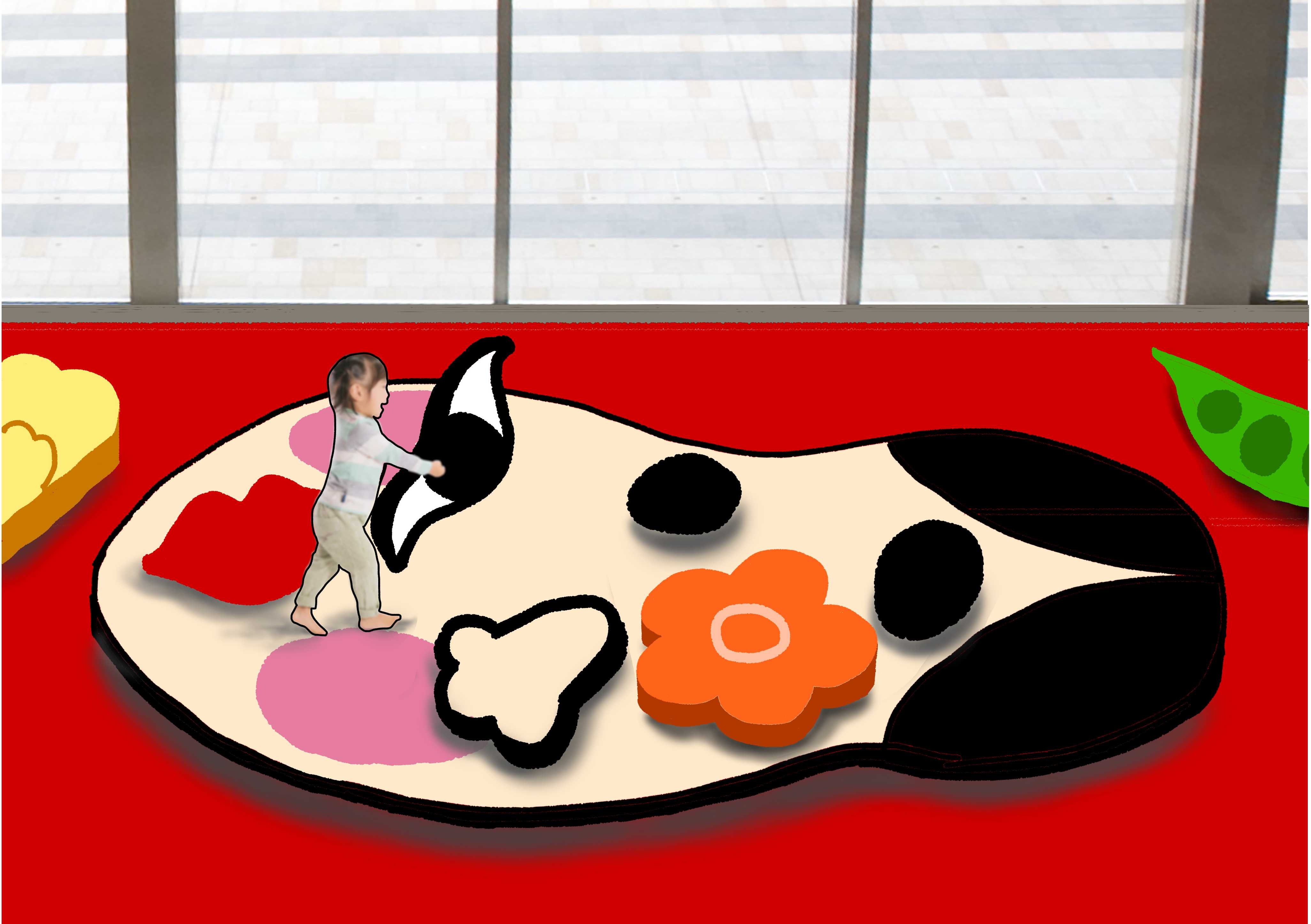 TOKYO MIDTOWN AWARD受賞アーティストの田中優菜氏が手掛ける「おおきな福笑い」。日本の伝統的なお正月遊び「福笑い」がビッグサイズで登場します。目や鼻などの顔のパーツに加えて、おせちの具材をイメージしたオリジナルのクッションを自由に配置しながら完成させる、全身を使って楽しむ体験型アートです。触ったり、動かしたり、寝転んで自分自身が作品の一部になってみたり、遊び方は自由自在!ご家族やお子様同士はもちろん、周りで見る方も一緒に楽しめる空間で、新しい年の始まりをお楽しみください。