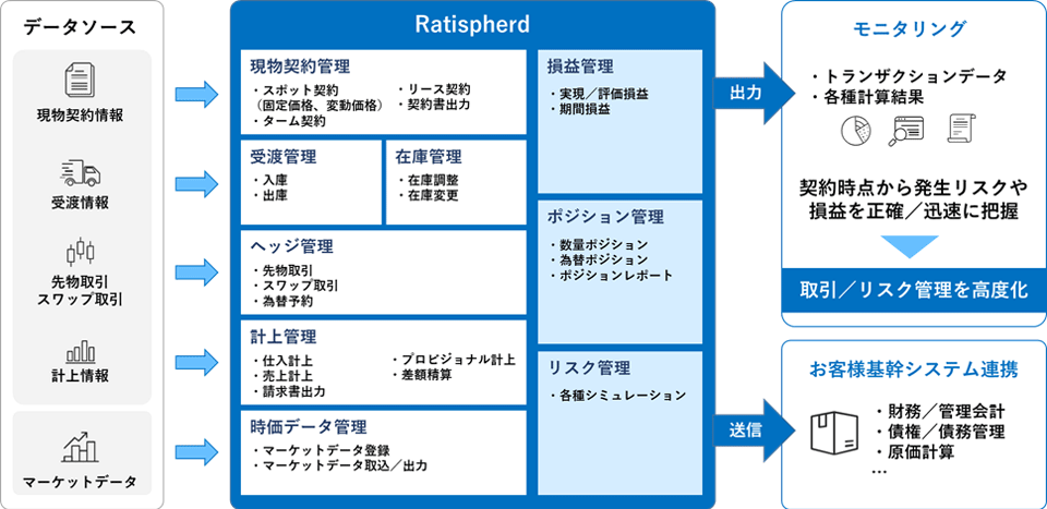 「Ratispherd」は、NSSOLが15年以上にわたり、商社・エネルギー会社へのシステム導入で培ったノウハウをもとに開発したコモディティ取引・リスク管理システムです。2011年に、当領域で初の日本国産パッケージ製品として提供を開始しました。現在までに、商社やエネルギー会社など14社への導入実績があり、非鉄金属、穀物、エネルギー等のコモディティ取引に関わる幅広い業務(取引管理、在庫管理、損益・ポジション管理など)をサポートしています。