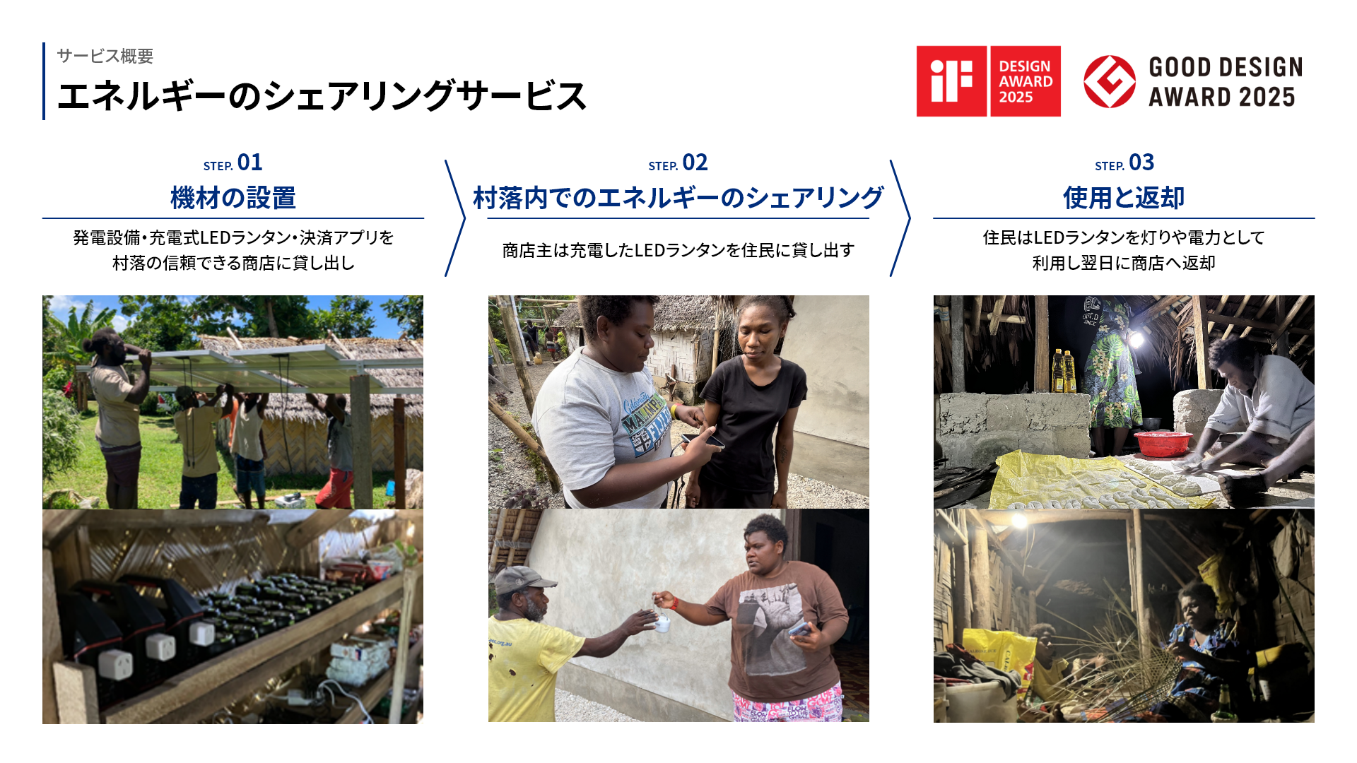 RT社が提供するサービスは、東芝がこれまで開発・試行してきた「Delighting Everyone Project(DEP)」を承継するもので、バヌアツ共和国マランパ州の未電化地域にある商店を拠点に、太陽光発電による充電式LEDランタンやバッテリーを地域住民に貸し出します。各商店には、東芝が開発した太陽光発電システムとスマートフォン向け決済アプリを導入し、地域が手軽かつ安価に電力へアクセスできる環境を構築します。このモデルは、大規模なインフラ投資を必要とせず、柔軟かつ迅速な展開が可能です。