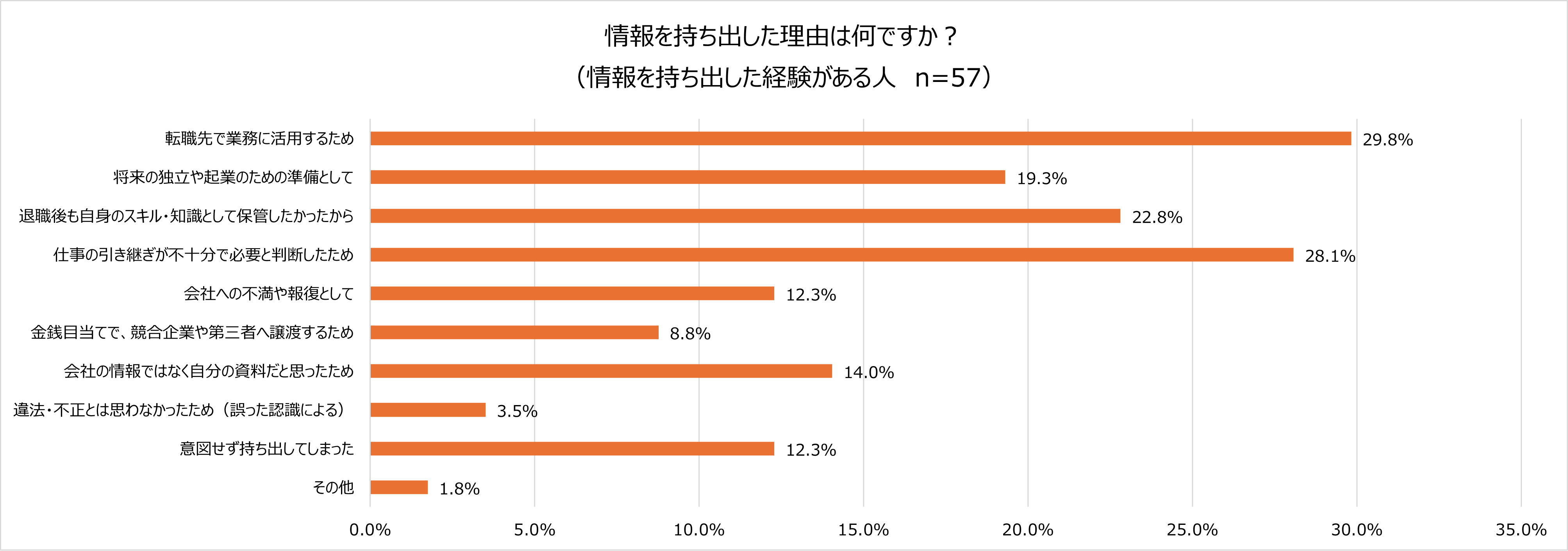 「情報を持ち出した理由は何ですか?」という質問に対しては、「転職先で業務に活用するため」が29.8%で最多の回答となっており、次いで「仕事の引き継ぎが不十分で必要と判断したため」が28.1%となりました。