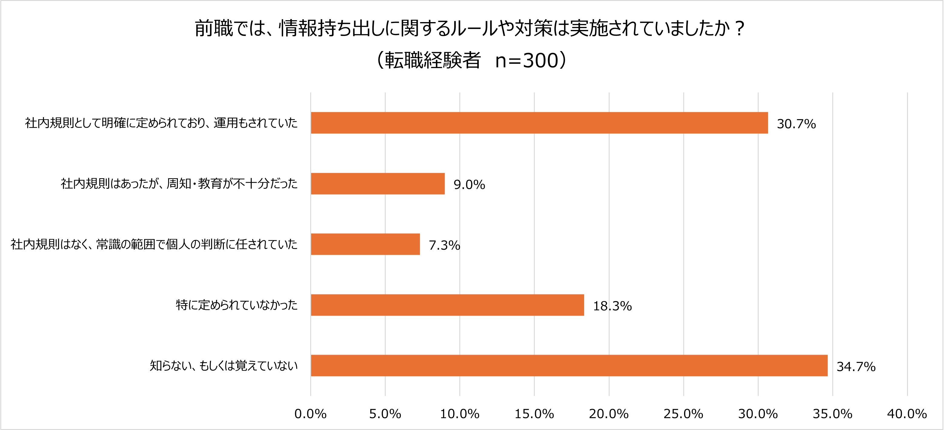 「前職では、情報持ち出しに関するルールや対策は実施されていましたか?」という質問に対しては、「知らない、もしくは覚えていない」という回答が34.7%で最多となりました。