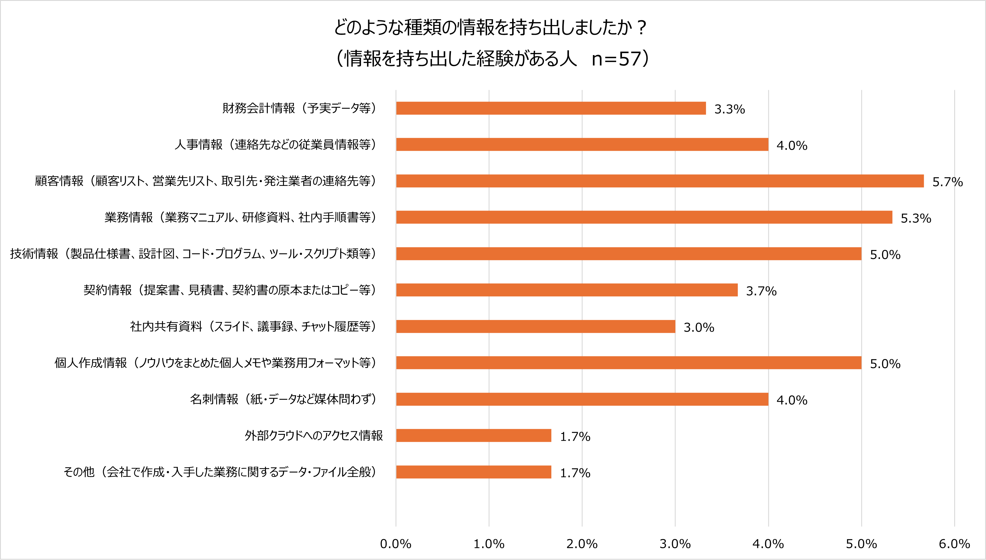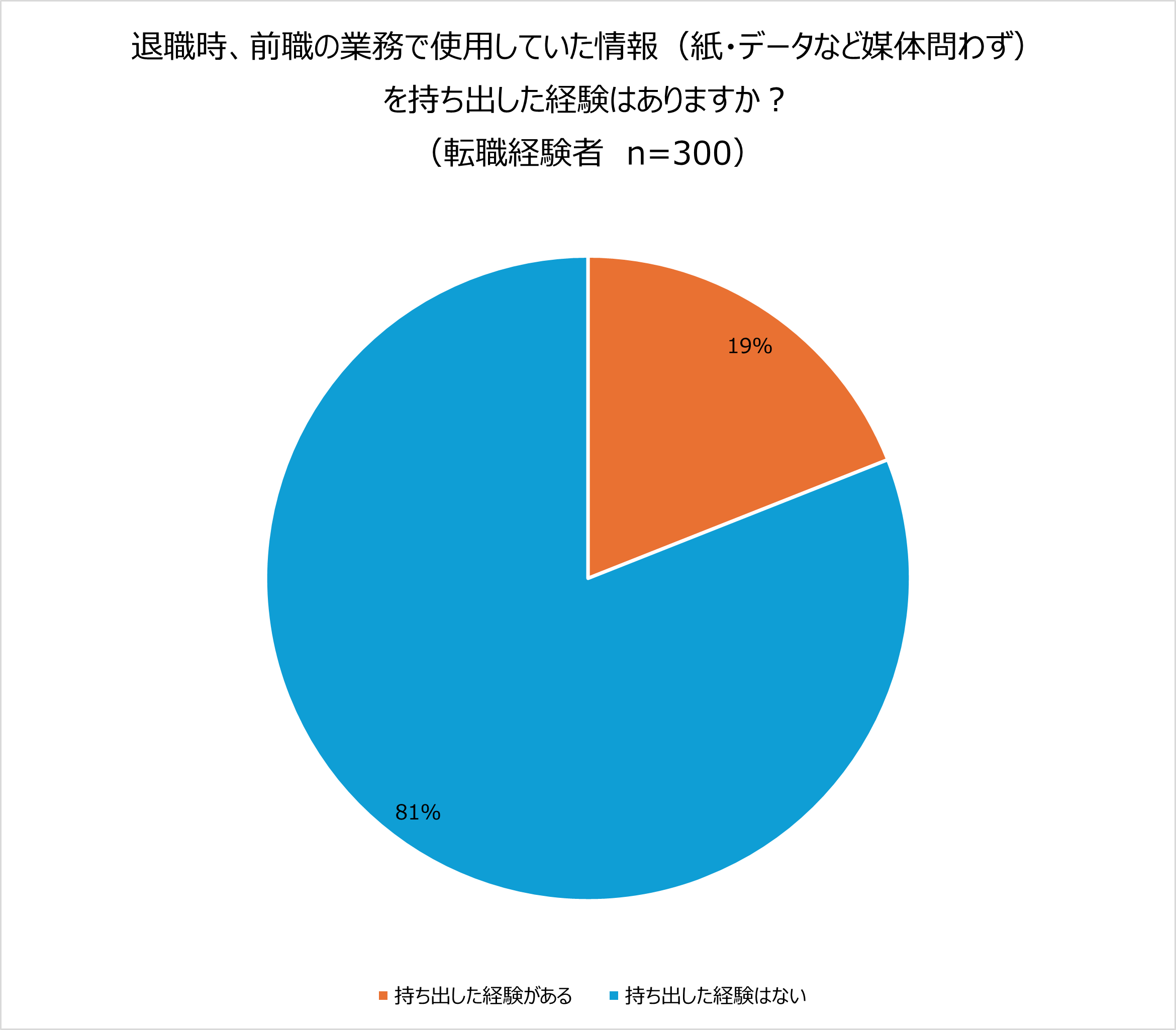 今回のアンケートから、転職経験者の約5人に1人が、転職時に前職の情報を持ち出した経験があることが分かりました。情報持ち出し件数の多さもさることながら、1人で複数の情報を持ち出すケースも少なくないという実態もあわせて明らかになっています。