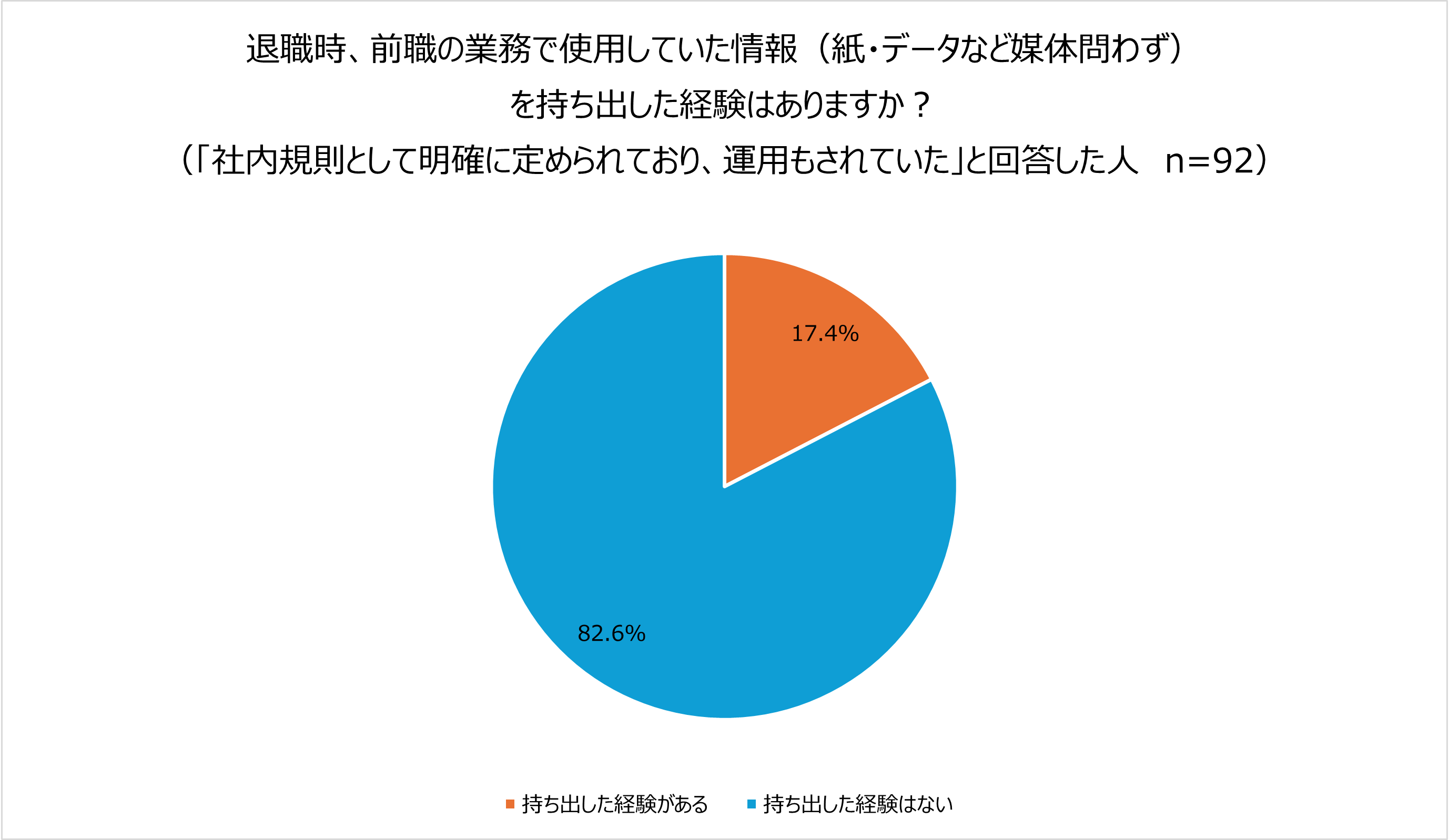 「社内規則として明確に定められており、運用もされていた」と回答した人の内訳を見ると、17.4%の人が情報を持ち出した経験があると回答しており、社内規則が定められている企業においても、情報持ち出しが発生していることが分かります。