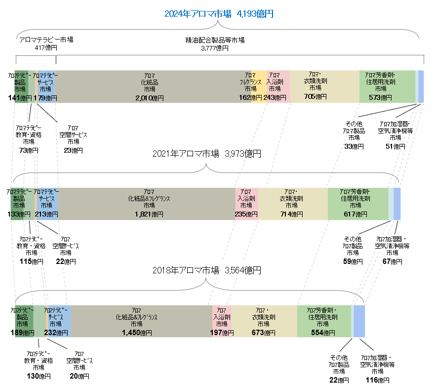 2024年のアロマ市場全体の市場規模は、4,193億円(事業者小売売上高ベース)と推計され、2021年と比較し約106%伸長した。構成内訳は以下のとおり。