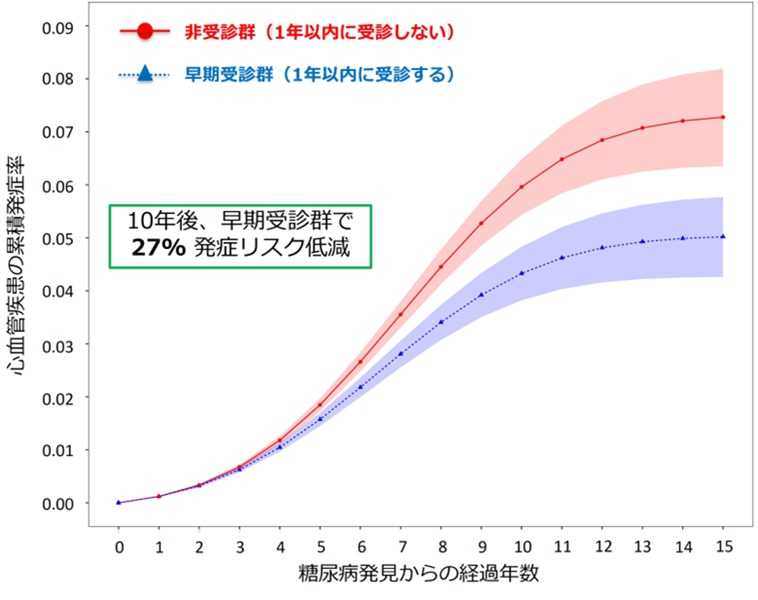 図1 各受診群における心血管疾患(虚血性心疾患および脳卒中)の累積発症率:青い点線(早期受診群)は、赤い実線(非受診群)に比べて、経過とともに心血管疾患の発症率が低く推移している
