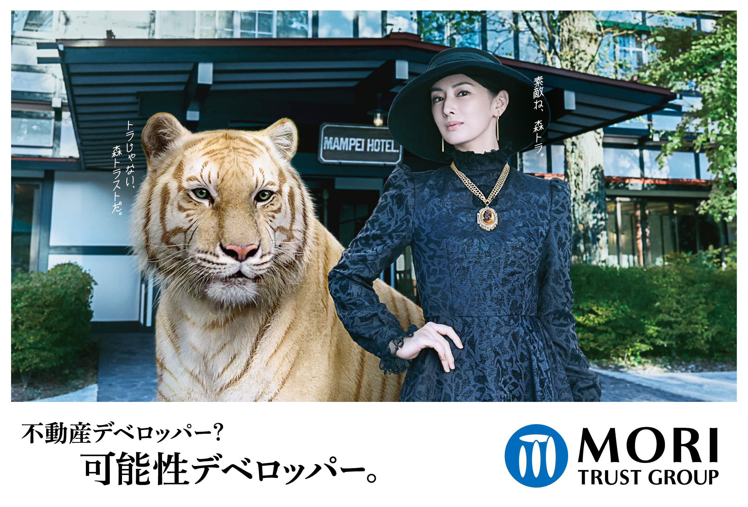 本CMでは、森トラストに魅了される北川景子さん扮する貴婦人と、パートナーであり森トラストに嫉妬するトラとの軽妙な掛け合いを通じて、当社事業の多様性と新ブランドメッセージ「可能性デベロッパー」を表現しています。貴婦人役は、近年役柄の幅がさらに広がり、俳優として新たな道を切り拓く無限の可能性と信頼感あるイメージを併せ持つ北川景子さん。森トラストの社名にちなんで登場するトラは、世界に30頭ほどしかいない「金色の毛並み」を有する希少なゴールデンタビータイガーをモデルとしたキャラクターです。