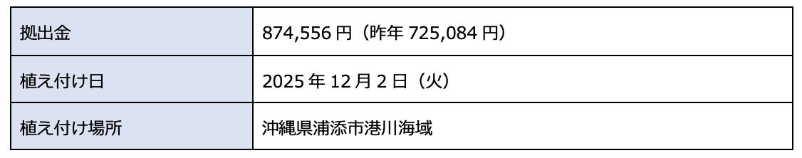 ※を実施し、このたび、拠出金の活用により養殖サンゴ160本の植え付けが完了しましたのでご報告します。