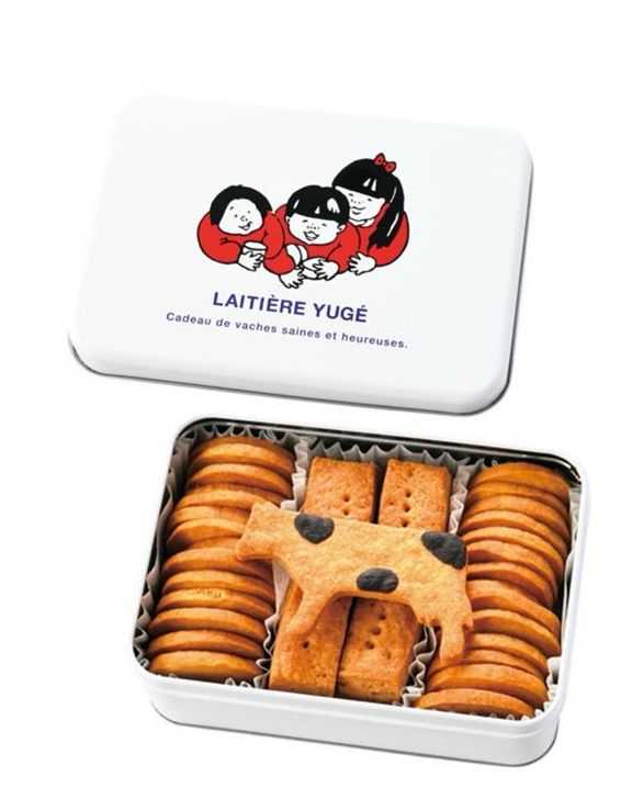 トレードマークの3人の子供がプリントされたオリジナル缶。弓削牧場を代表するチーズ、カマンベールチーズとフロマージュフレの2種のクッキーです。