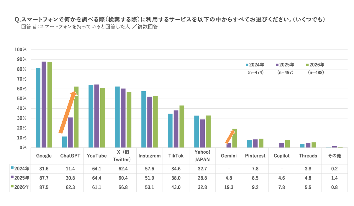 - スマホ検索サービス、利用率1位は「Google」87.5%。2位「ChatGPT」62.3%。