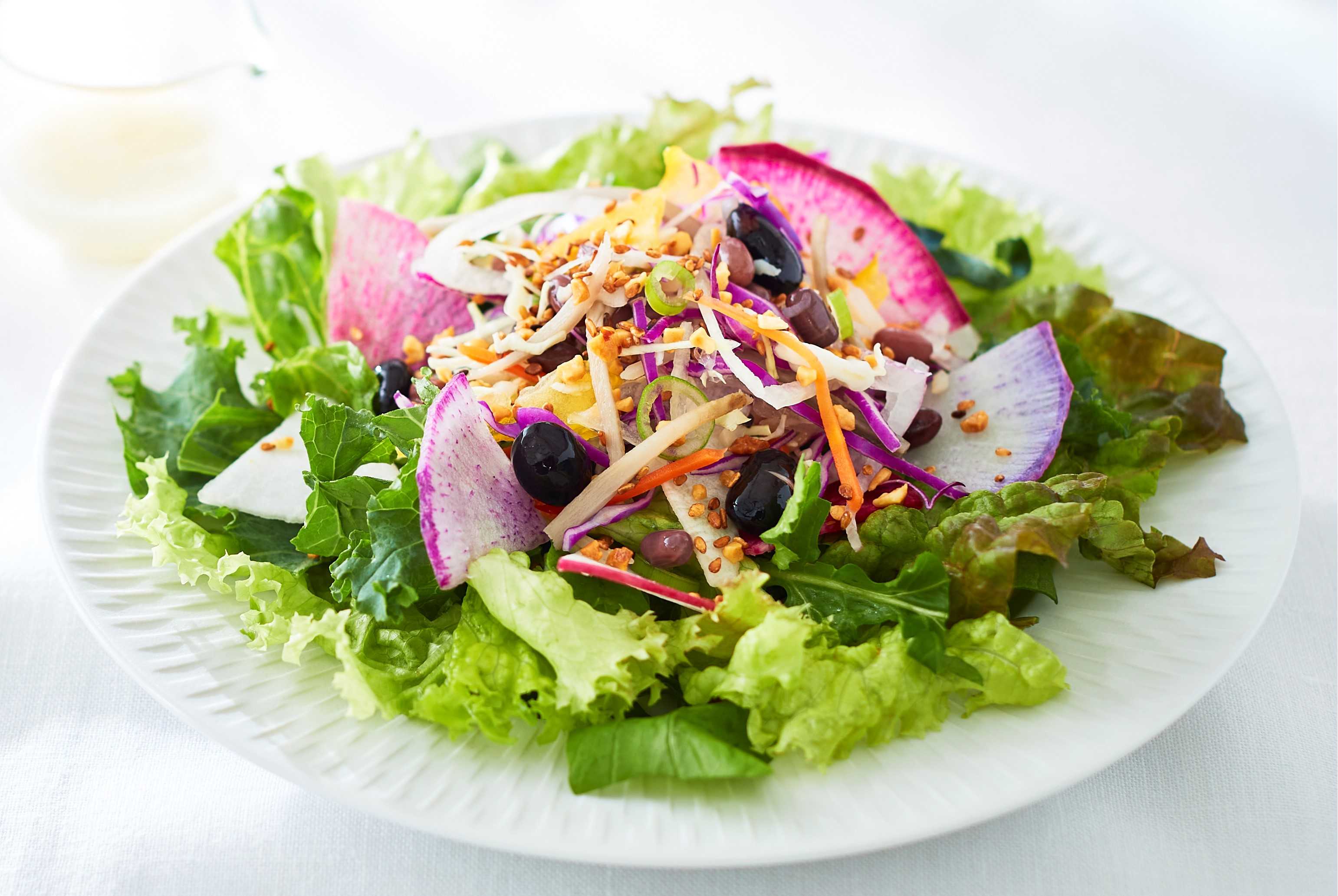 聖護院かぶら、堀川ごぼう、京たけのこなどの京野菜を加えた30品目サラダ。素材が引き立つ美味しさの「和風ガーリックドレッシング」または、千鳥酢の優しい酸味に塩麹の旨みを合わせた「塩麹と千鳥酢のドレッシング」でお楽しみください。