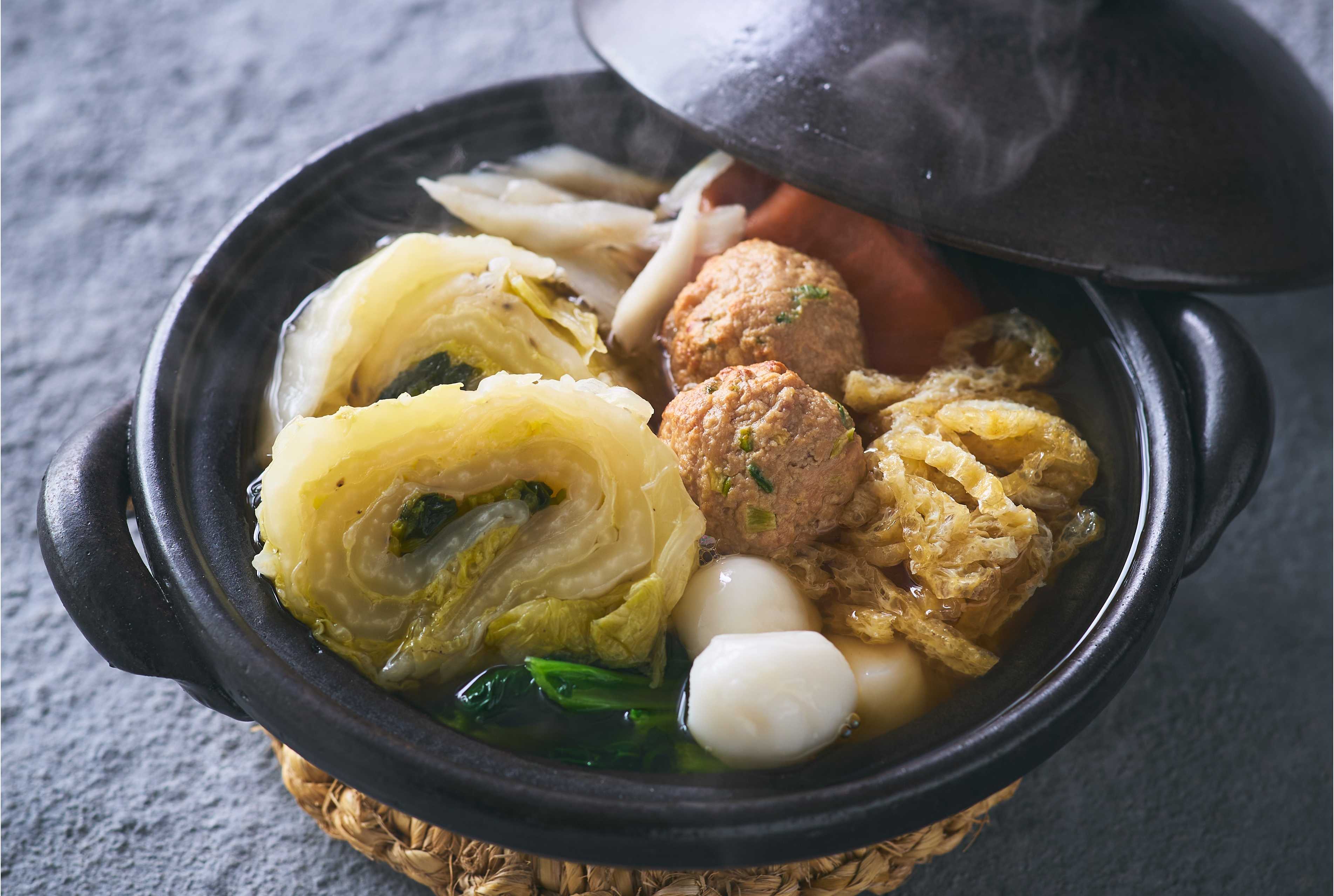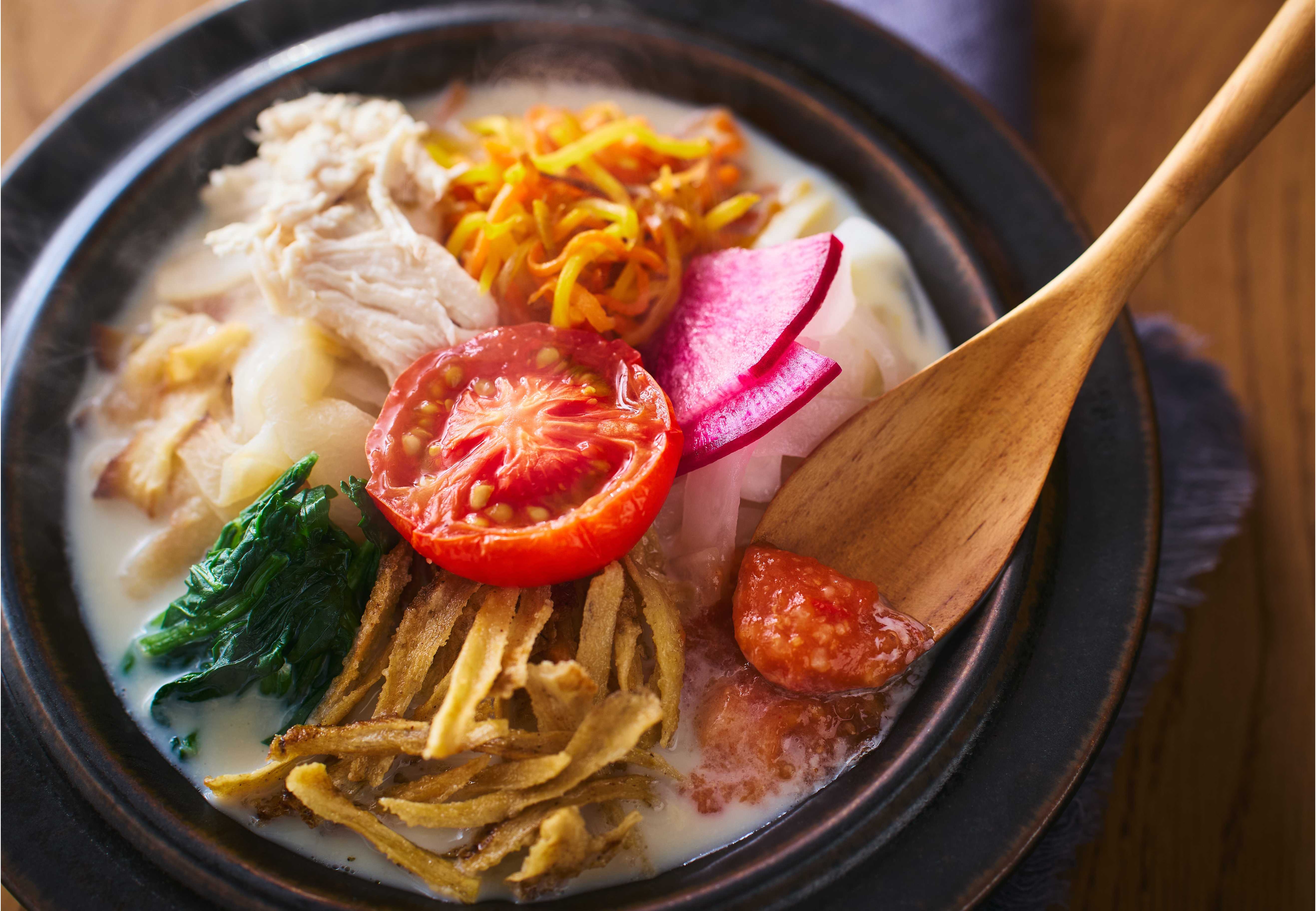 具材の焼きトマトとトマト醤(じゃん)に、カゴメ「高リコピントマト」を使用。トマトと調味料、柚子で作ったトマト醤は、スープに溶かすとコクと柚子の香りが広がり、野菜350gを最後までおいしく楽しめます。