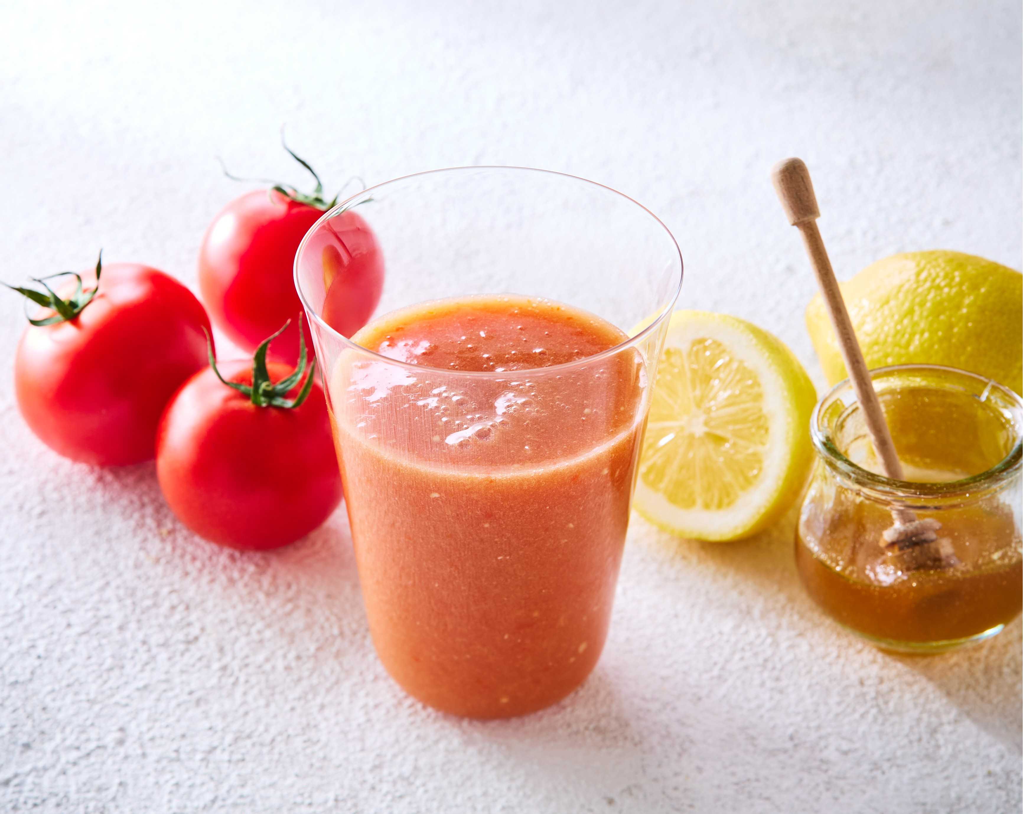 トマトはカゴメ「高リコピントマト」を使用。自社でトマトレモンジャムを作り味わいに深みを加え、レモンピール入りで、後味も香りもすっきり。はちみつでほんのり甘く仕上げ、トマトが苦手な方にも飲みやすい味わい。寒い日には温めて、やさしい甘さと香りを楽しめます。