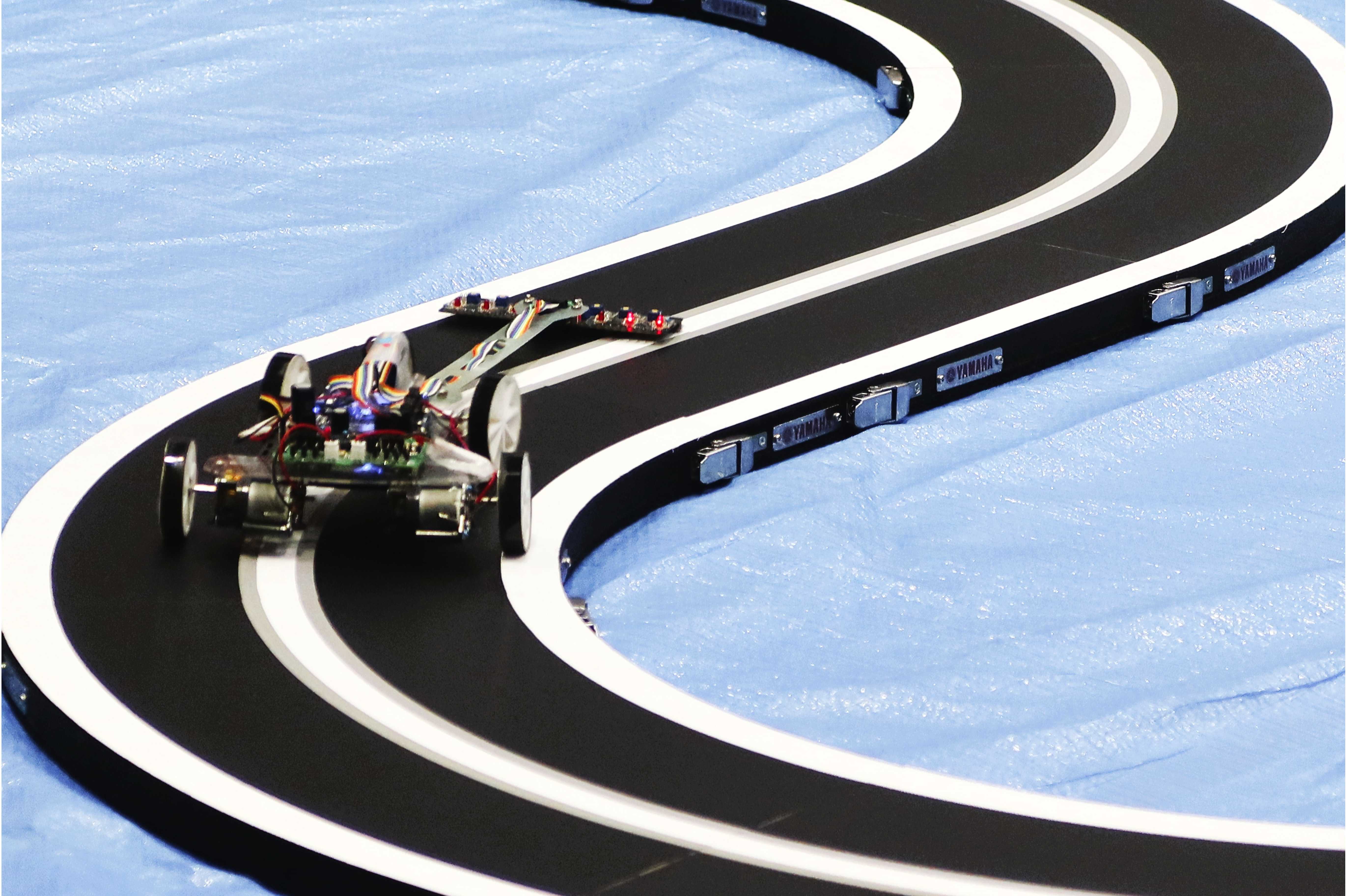 センサーでコースを読み取りながら走るマイコンカー。公平かつ安全に競い合えるよう、精緻な設計・加工が施された競技用のコース