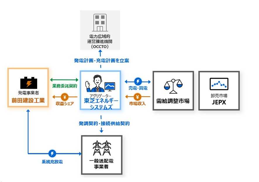 本事業では、前田建設は事業主として本事業を推進する特定目的会社(SPC)への出資や技術・運用に関する戦略の策定などを行います。東芝ESSはアグリゲーター(特定卸供給事業者)として、独自の需要予測技術などを活用し、電力市場価格が高騰する時間帯など適切なタイミングで卸売市場(JPEX)や需給調整市場(EPRX)で取引することにより運用収益最大化を目指すとともに、中部エリアの電力供給の安定化に貢献します。