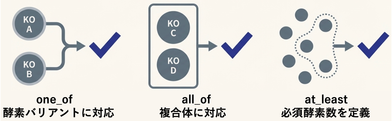 15種の代表的な化学合成独立栄養細菌のゲノム情報と文献情報を基に、既知の7つのCO₂固定経路すべてについて、経路の存在を特定するために不可欠な「マーカー酵素」とそれに対応する遺伝子のKEGG Orthology(KO)IDを定義しました(図1)。酵素の多様性に対応するため、「この遺伝子群のうち少なくとも1つがあればよい(one_of)」や「複合体を作るすべての遺伝子が必要(all_of)」といった柔軟な論理ルールを策定しました(図2)。