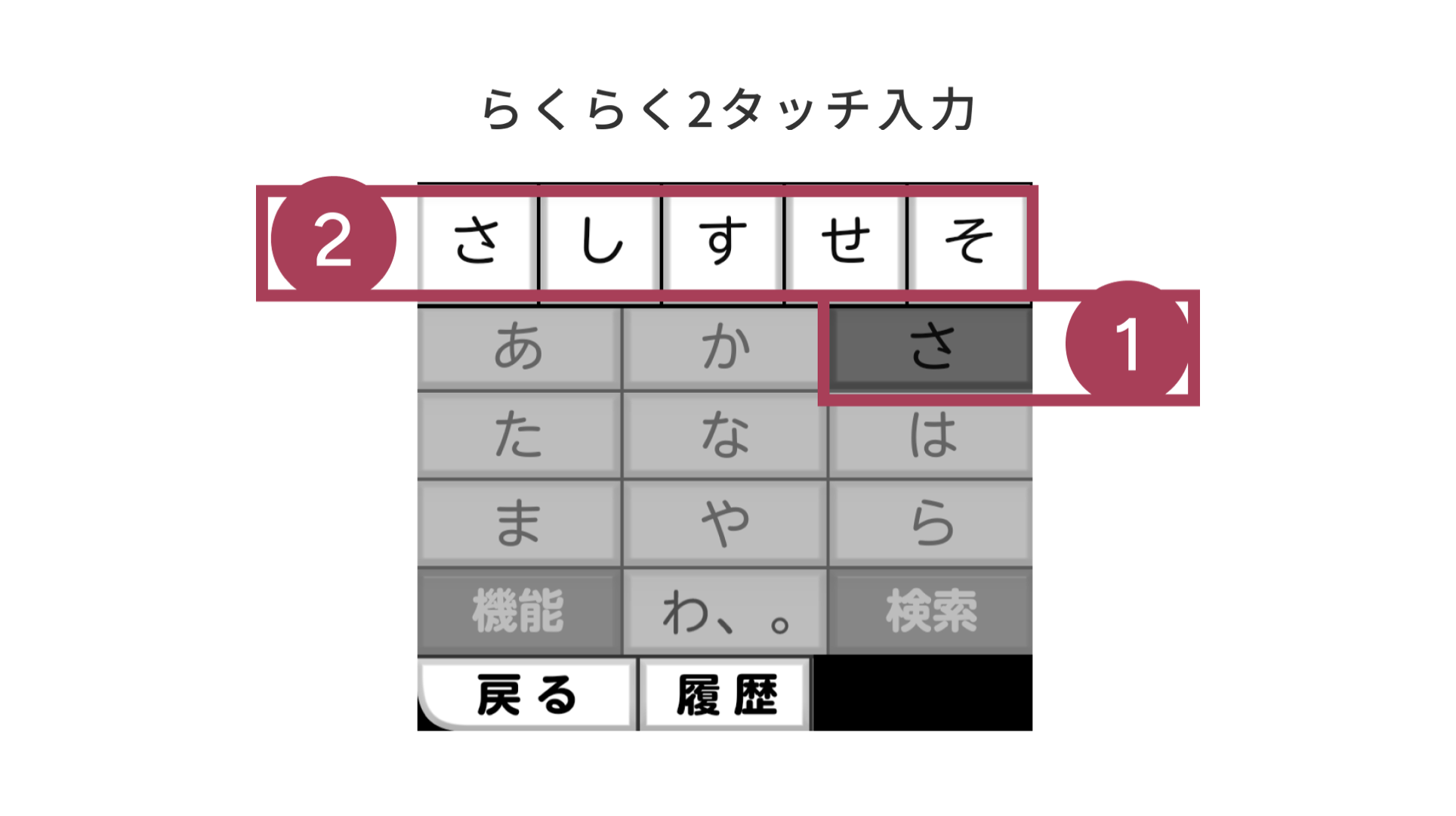 文字入力はSuper ATOK ULTIASを搭載しており、「らくらく2タッチ入力」によって入力間違いを防ぎやすくするので、あんしんしてお使いになれます(らくらくフリック入力に切り替え可能)。