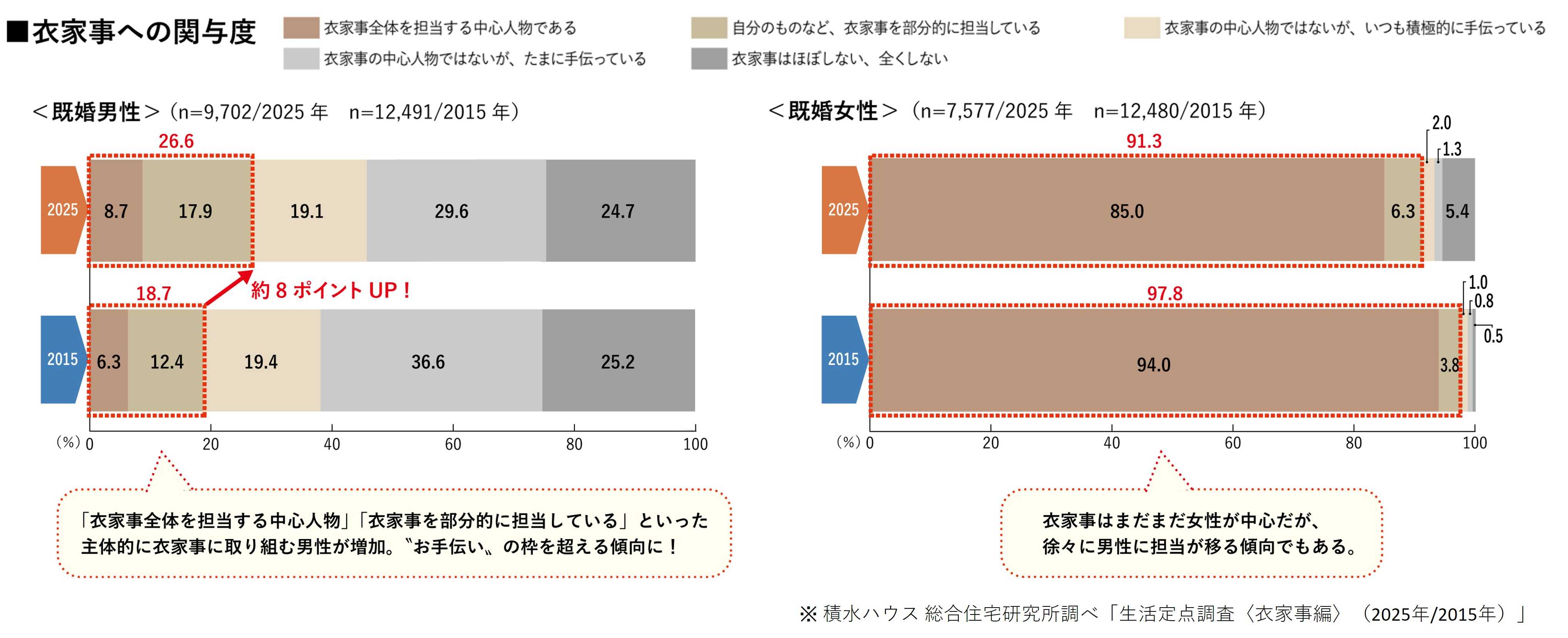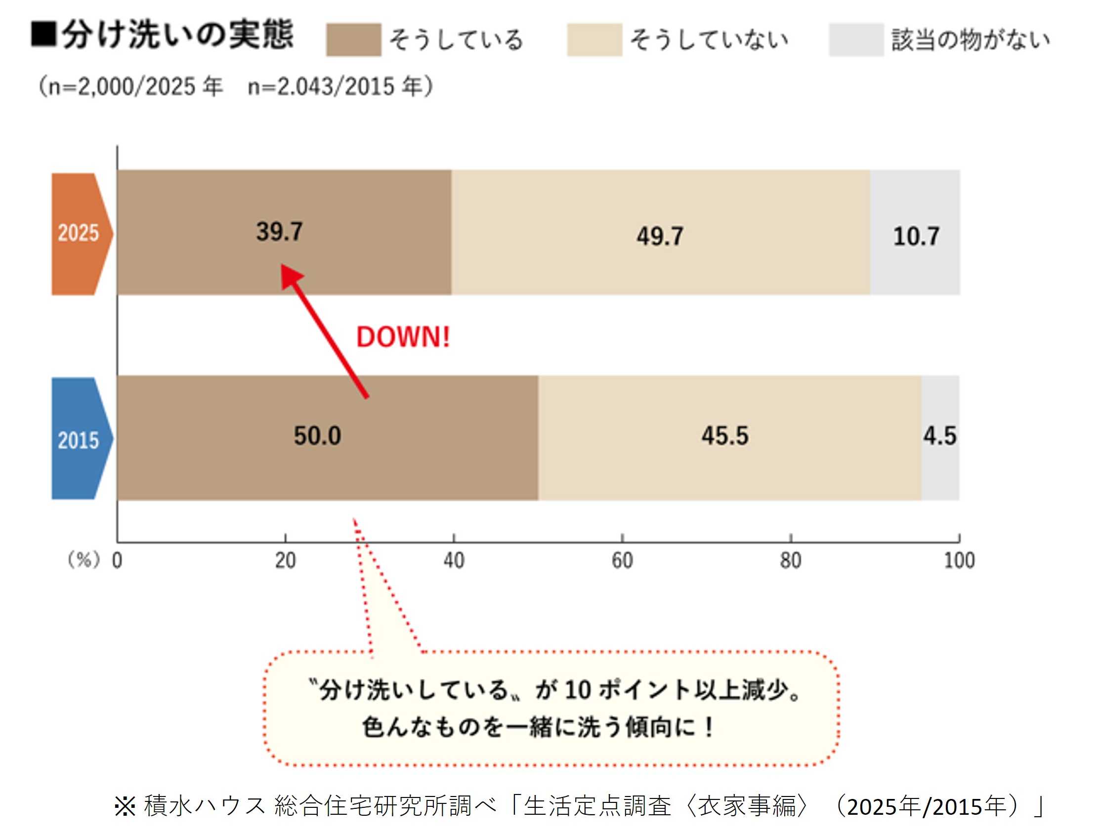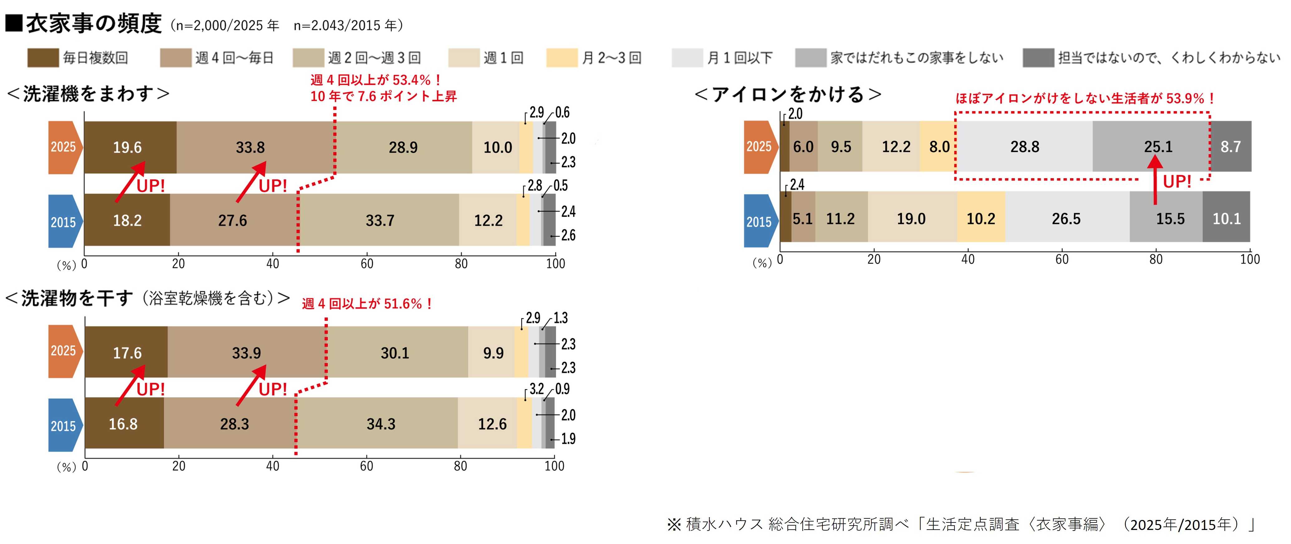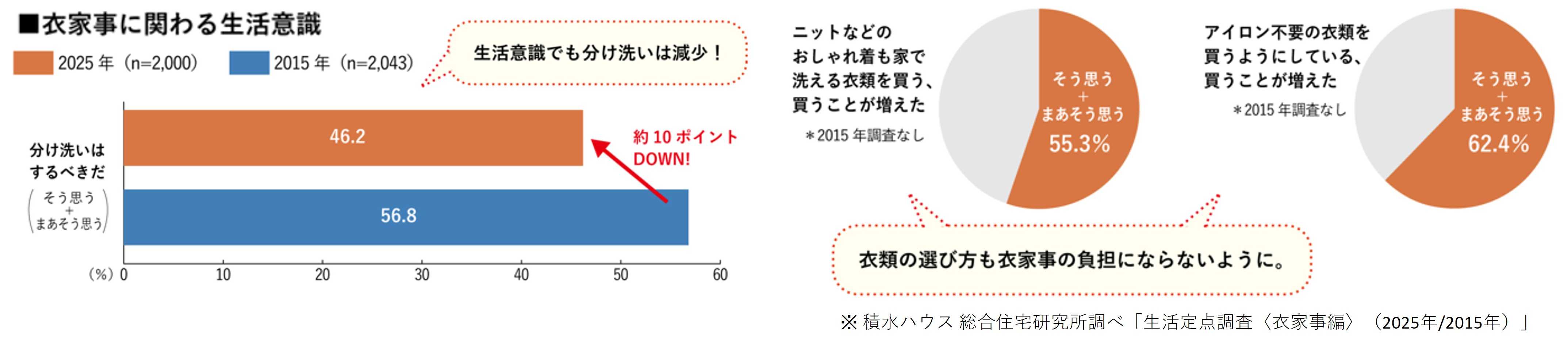 ・引用元が「積水ハウス株式会社 総合住宅研究所」による調査である旨と、引用元調査「生活定点調査〈衣家事編〉(2025年/2015年)」の記載をお願いします。