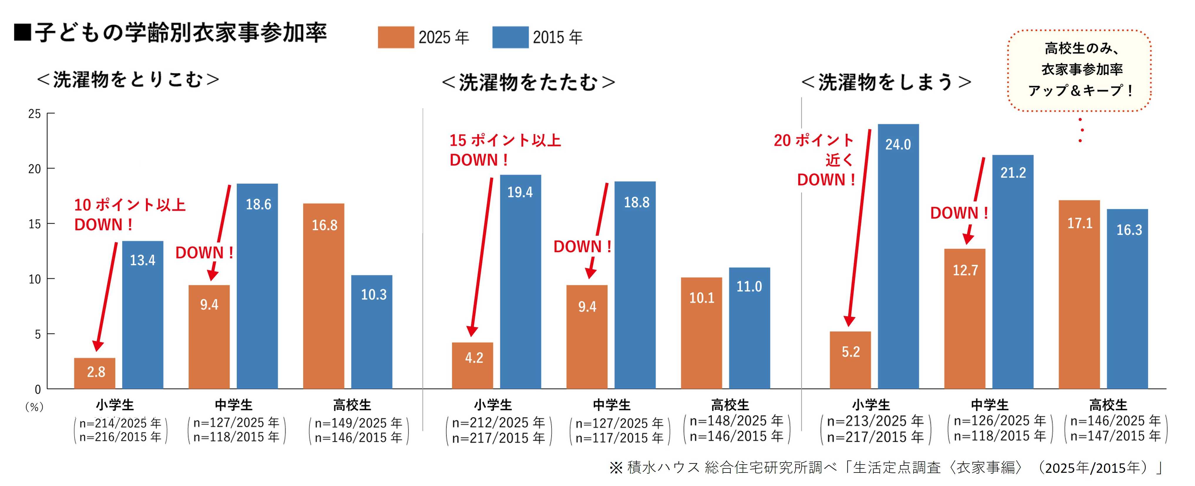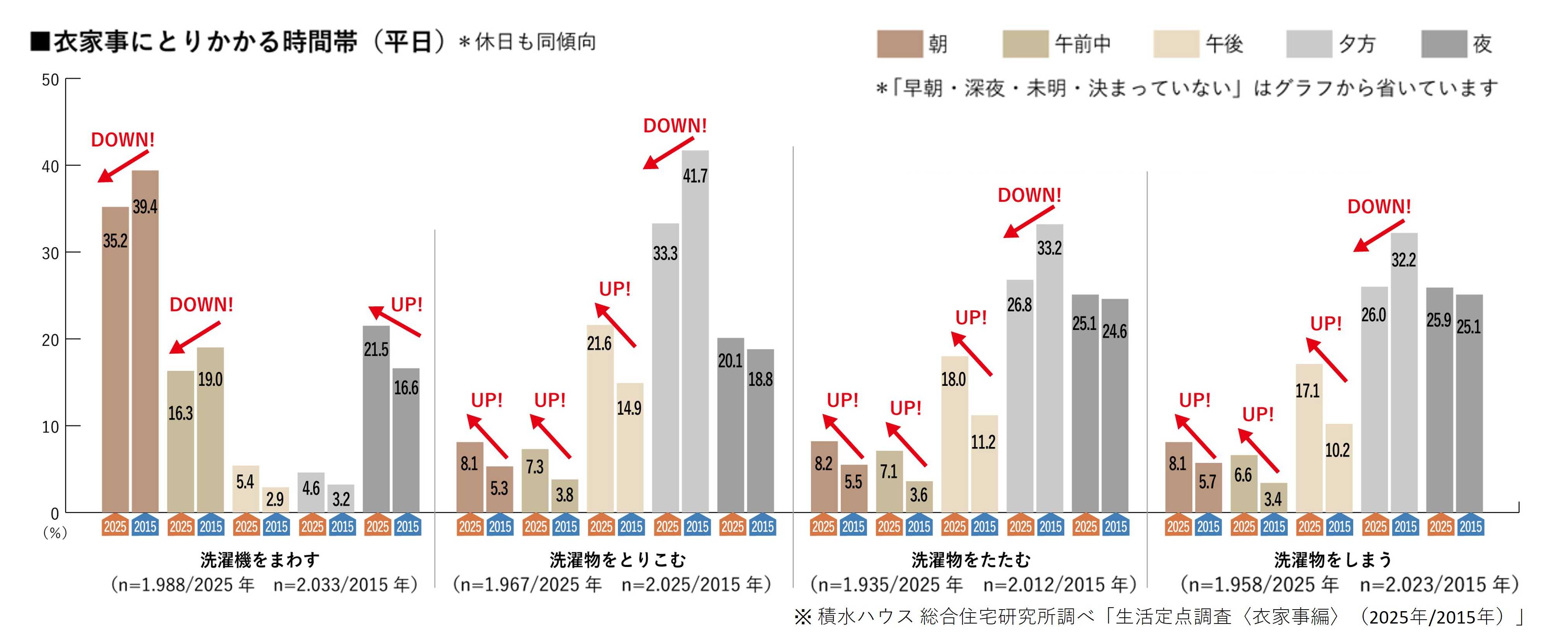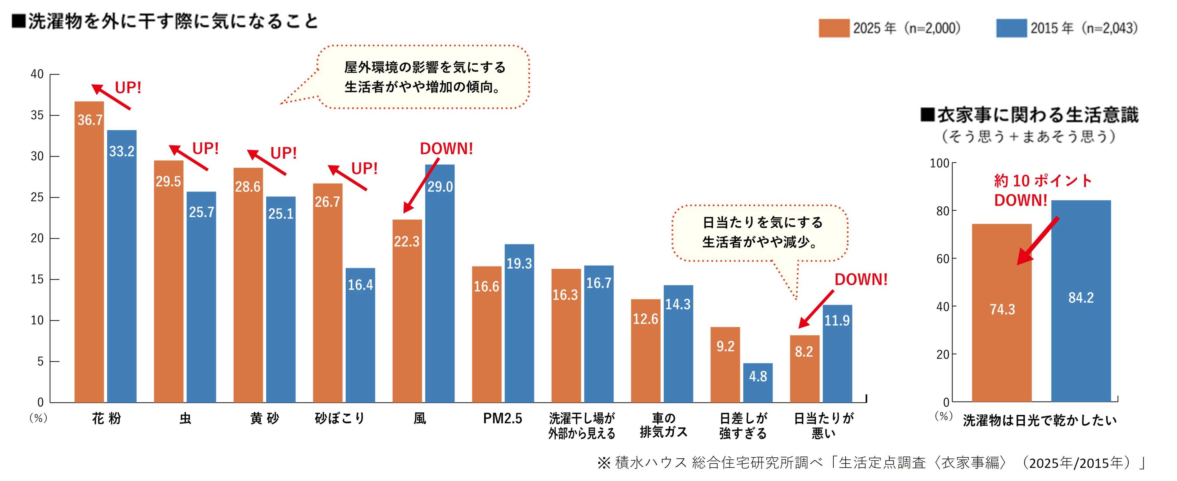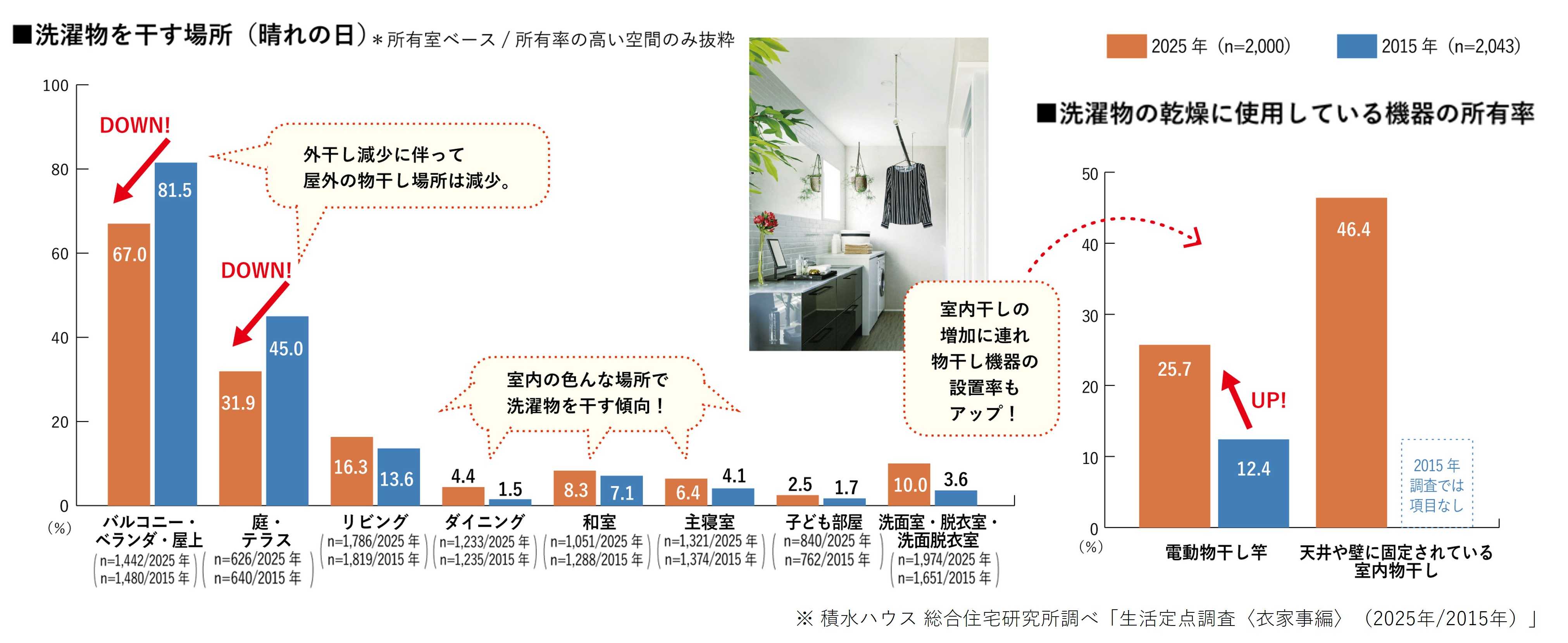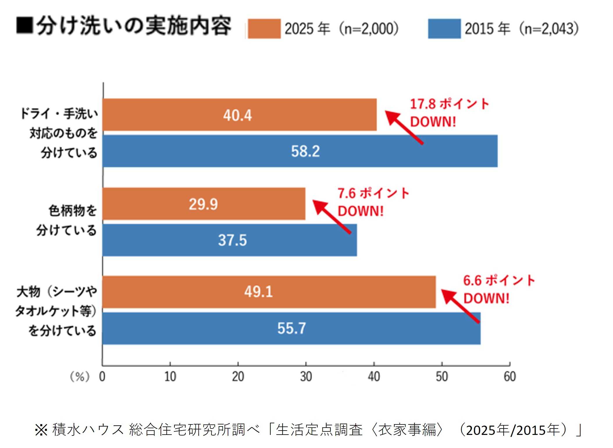 ・引用元が「積水ハウス株式会社 総合住宅研究所」による調査である旨と、引用元調査「生活定点調査〈衣家事編〉(2025年/2015年)」の記載をお願いします。