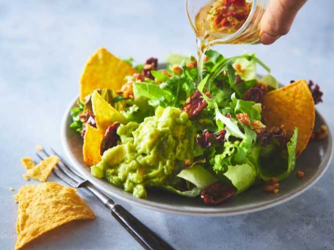 アボカドをベースにしたメキシコ発祥のディップソース「ワカモレ」をサラダにしました。ライム香るサルサドレッシングをかけてお召し上がりください。
