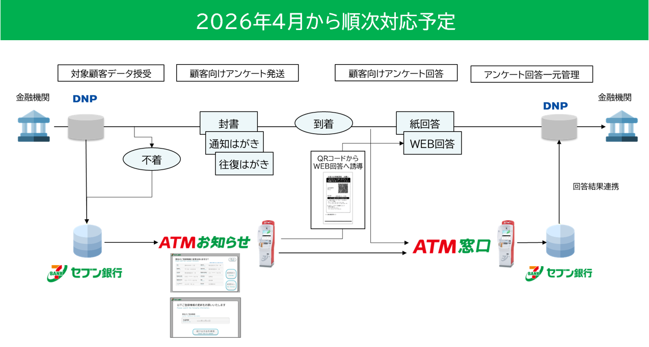 株式会社セブン銀行(本社:東京都千代田区、代表取締役社長:松橋 正明)は、大日本印刷株式会社(本社:東京都新宿区、代表取締役社長:北島 義斉、以下:DNP)と協業し、継続的顧客管理および外国人在留期限管理を目的としたBPO(ビジネス・プロセス・アウトソーシング)サービスの提供を2026年4月(予定)に開始する基本合意書を締結しました。本協業により、セブン銀行「+Connect」(プラスコネクト)の「ATMお知らせ」・「ATM窓口」サービスと、DNPが提供する「継続的顧客管理 汎用サービス」・「在留期限確認サービス」を連動させ、顧客情報更新から在留期限管理までをワンストップで金融機関へ提供できるようになります。
