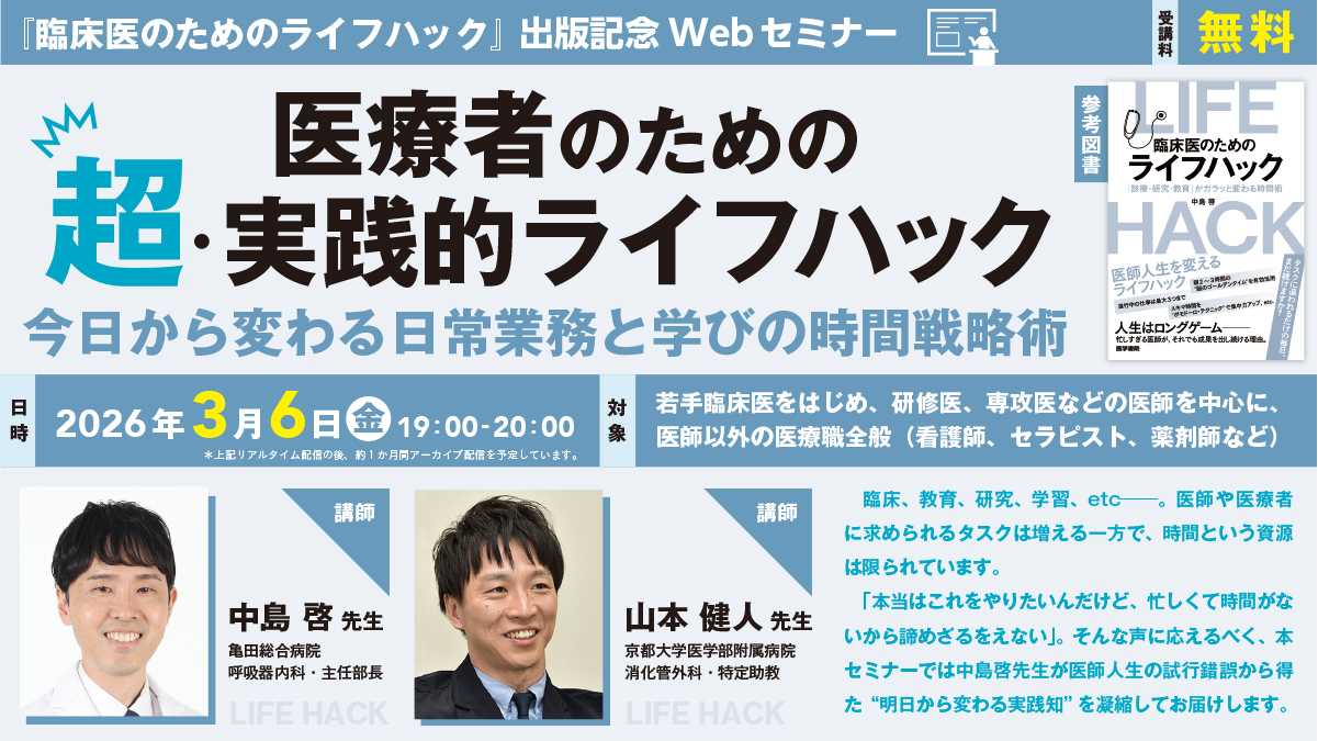 株式会社医学書院 (所在地:東京都文京区、代表取締役社長:金原 俊)は、医師、研修医、そのほかライフハックに興味のある医療職全般に向けた無料Webセミナー『医療者のための超・実践的ライフハック 今日から変わる日常業務と学びの時間戦略術』を2026年3月6日(金)19:00~20:00に開催します。