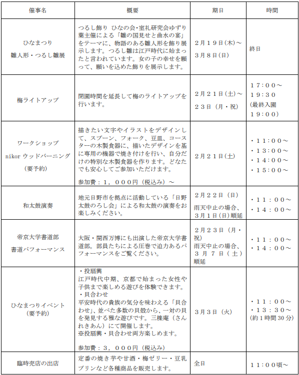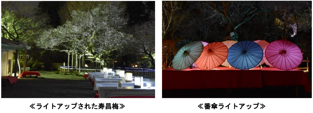 2月21日(土)~23日(月・祝)は、梅のライトアップを実施し、閉園時間を19時30分(最終入園19時00分)まで延長します。