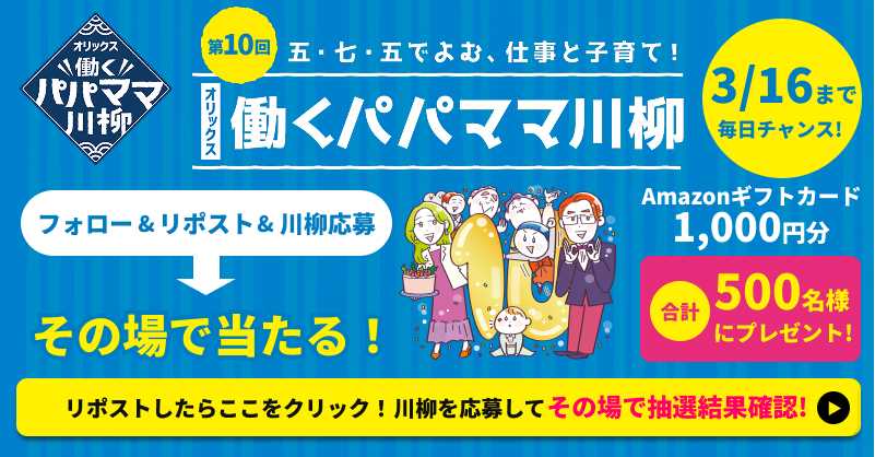 さらに「オリックス 働くパパママ川柳」公式Xアカウント(@orix_senryu)では、抽選で500名様に「Amazonギフトカード1,000円分」が当たるキャンペーンも実施。ぜひご応募ください。