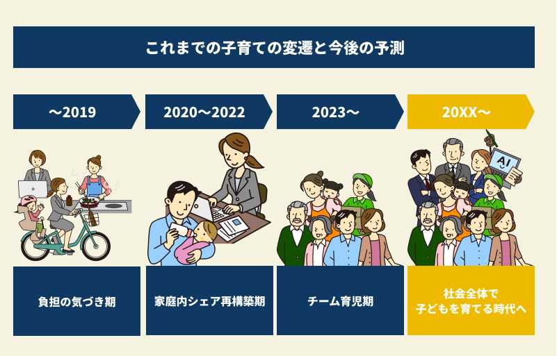 これからの少子高齢化社会おいては、テクノロジーの活用による負担軽減や周囲の力を上手く借りるための仕組みの拡充が求められます。そして、パパママだけが家庭の問題として育児を抱え込む時代は終わり、「社会全体で子どもを育てる時代」が到来することが期待されます。
