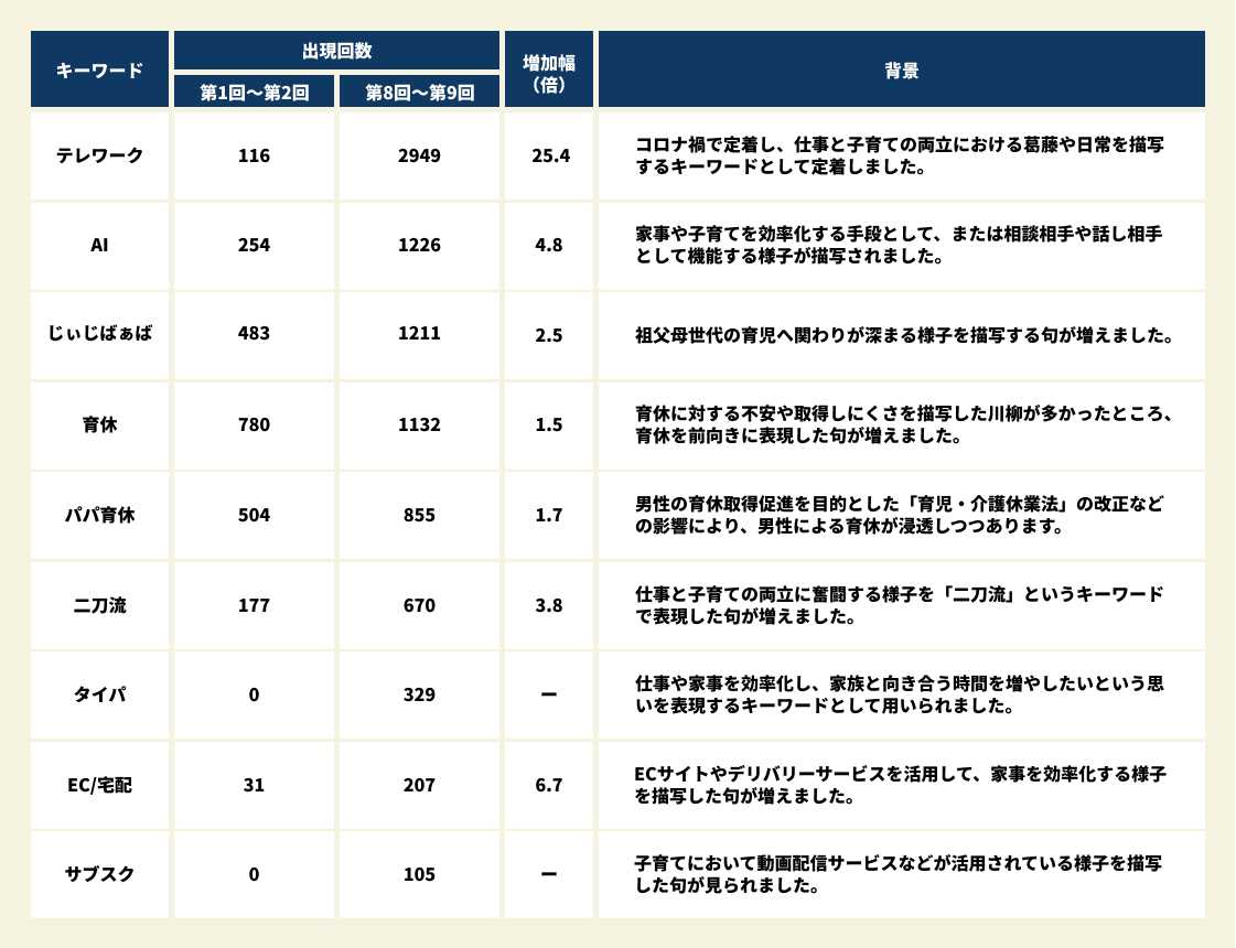 このたび第10回の開催を機に、過去9年間にわたり蓄積された応募作品(約50万句)を通して、仕事と子育てを取り巻く環境変化を分析しました。