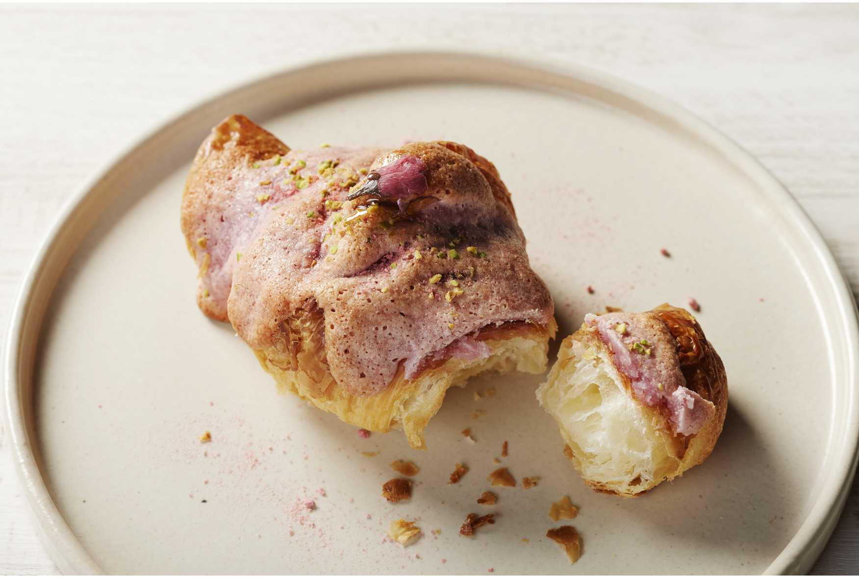 桜色のメレンゲをのせたクロワッサンに、桜の塩漬けと桜チップをトッピング。サクサクとした食感とともに、口いっぱいに桜の香りが広がる、春限定のクロワッサンです。