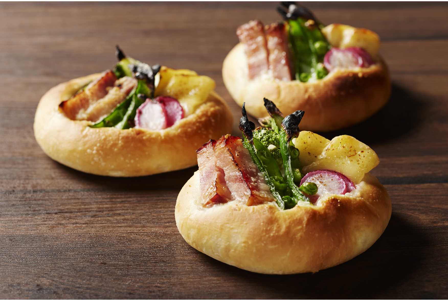 厚切りベーコンとカマンベールチーズに、アスパラガス、ブロッコリー、スナップエンドウ、ラディッシュを合わせました。シークラムとレモンを加えたベシャメルソースに、ブラックペッパーが味を引き締める、春らしいフォカッチャです。