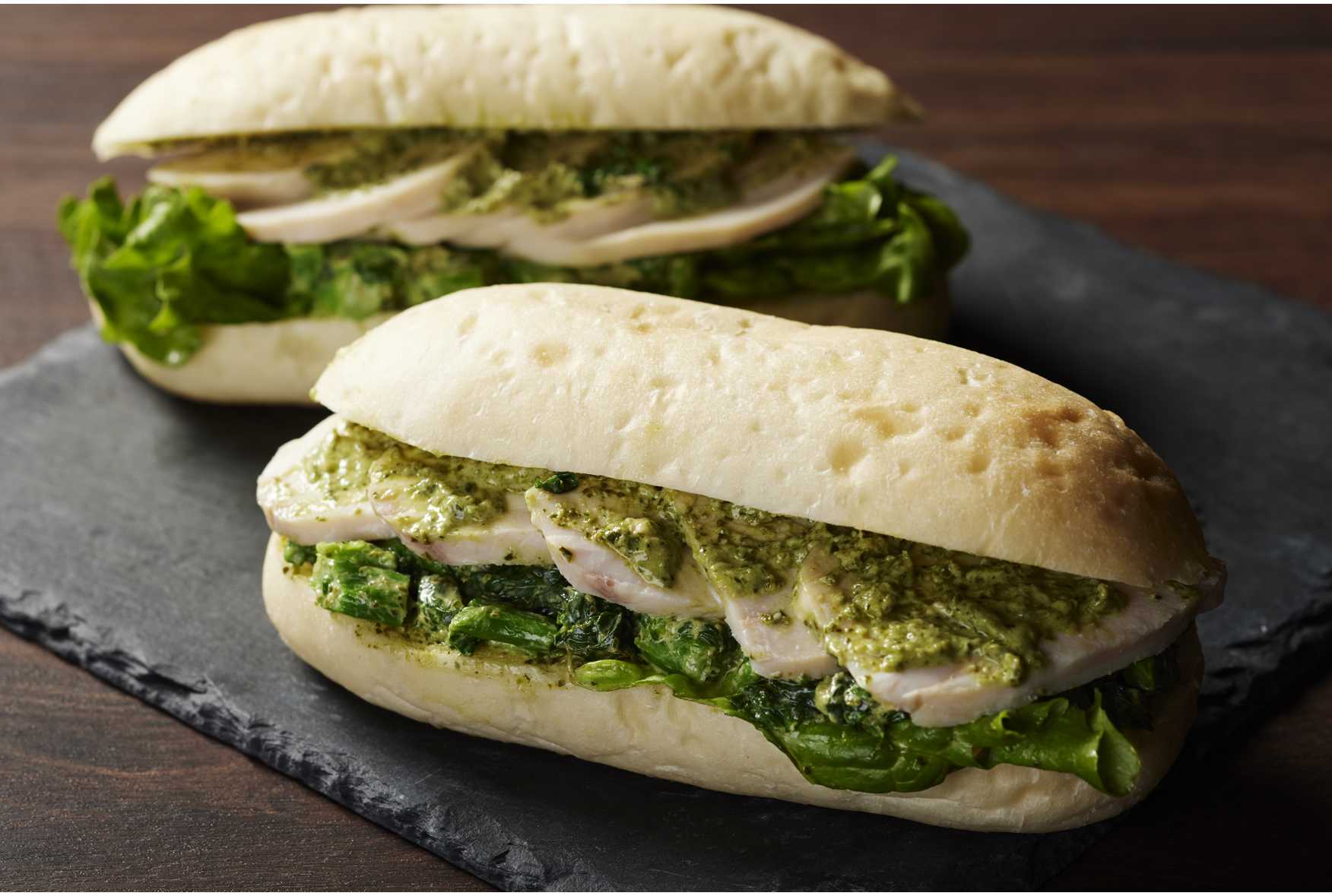 柔らかなホワイトブレッドにチキンと菜の花を合わせ、バジルとマヨネーズのソースをサンド。バジルの香りを軽やかに楽しめる、春らしい味わいのサンドイッチです。