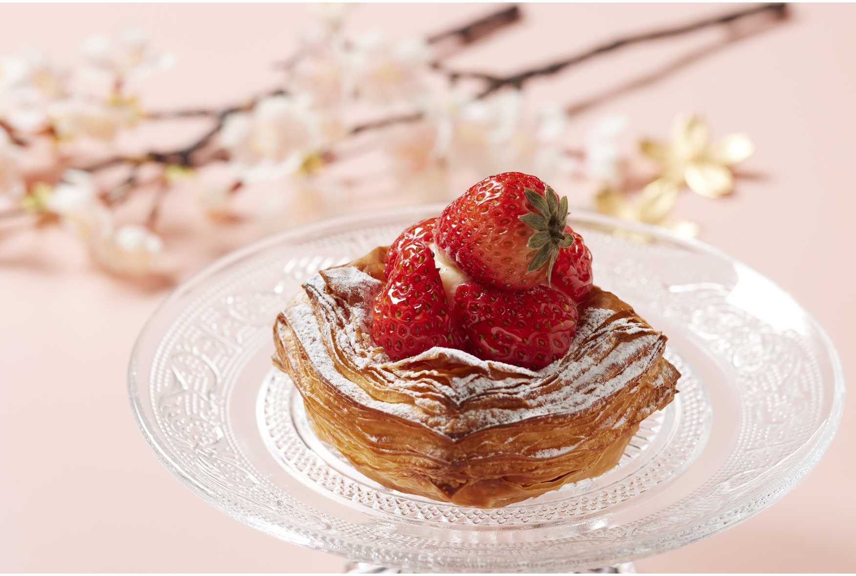 桜色に仕上げた生地に、桜あんとカスタードを重ね、いちごと桜チップをトッピング。いちごの程よい酸味と、見た目にも春らしい可愛らしさが印象的な一品です。