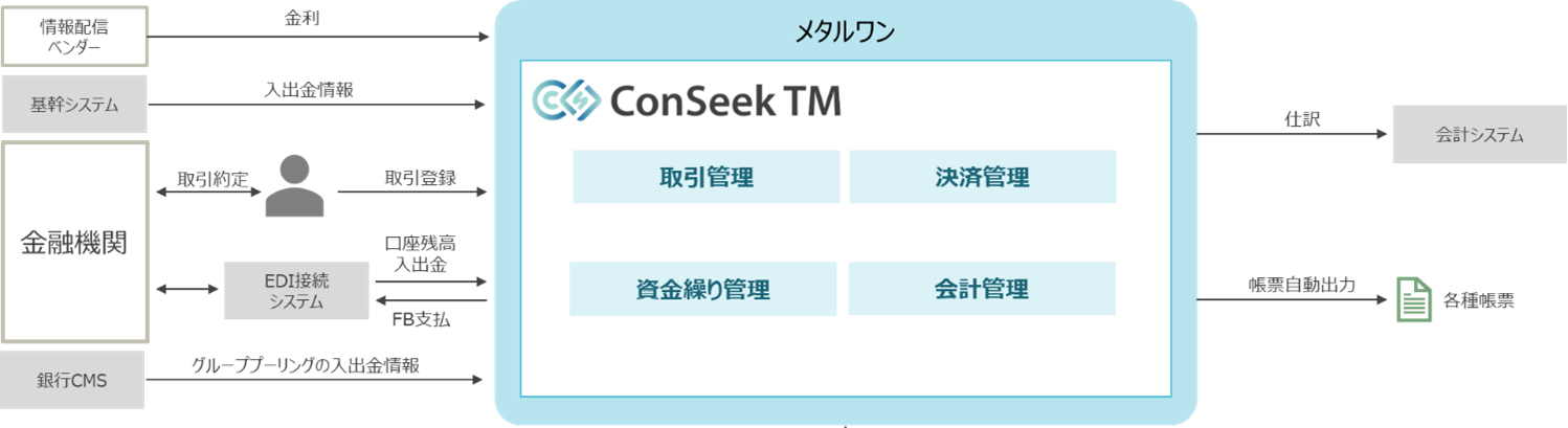 「ConSeek TM」は、取引管理、決済管理、口座残高・資金繰り管理、金融機関接続、会計仕訳など、財務業務を包括的且つ一気通貫で支援する多彩な機能を備えており、「ConSeek TM」を導入することで、財務業務の効率化・自動化とガバナンス強化を実現します。