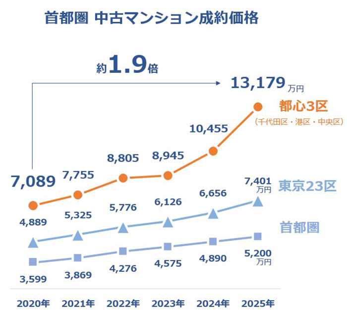 新築マンション供給戸数の減少傾向が続く一方で、中古マンション市場はここ数年、価格・成約数ともに増加しています。特に都心3区(千代田区、港区、中央区)での価格上昇は顕著で、平均成約価格は2020年の7,089万円から2025年の13,179万円と、5年間で約1.9倍に上昇しています。また、1億円以上の成約件数は、2020年の376戸から2025年の1,764戸へと、約4.7倍に増加しています。