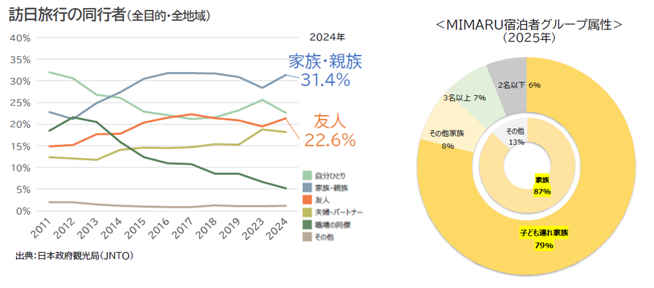 - 市場環境:訪日外国人旅行者数は過去最高を更新中。なかでも子ども連れ家族の長期滞在ニーズが急増する一方、それを受け止める高機能な宿泊施設が求められています。